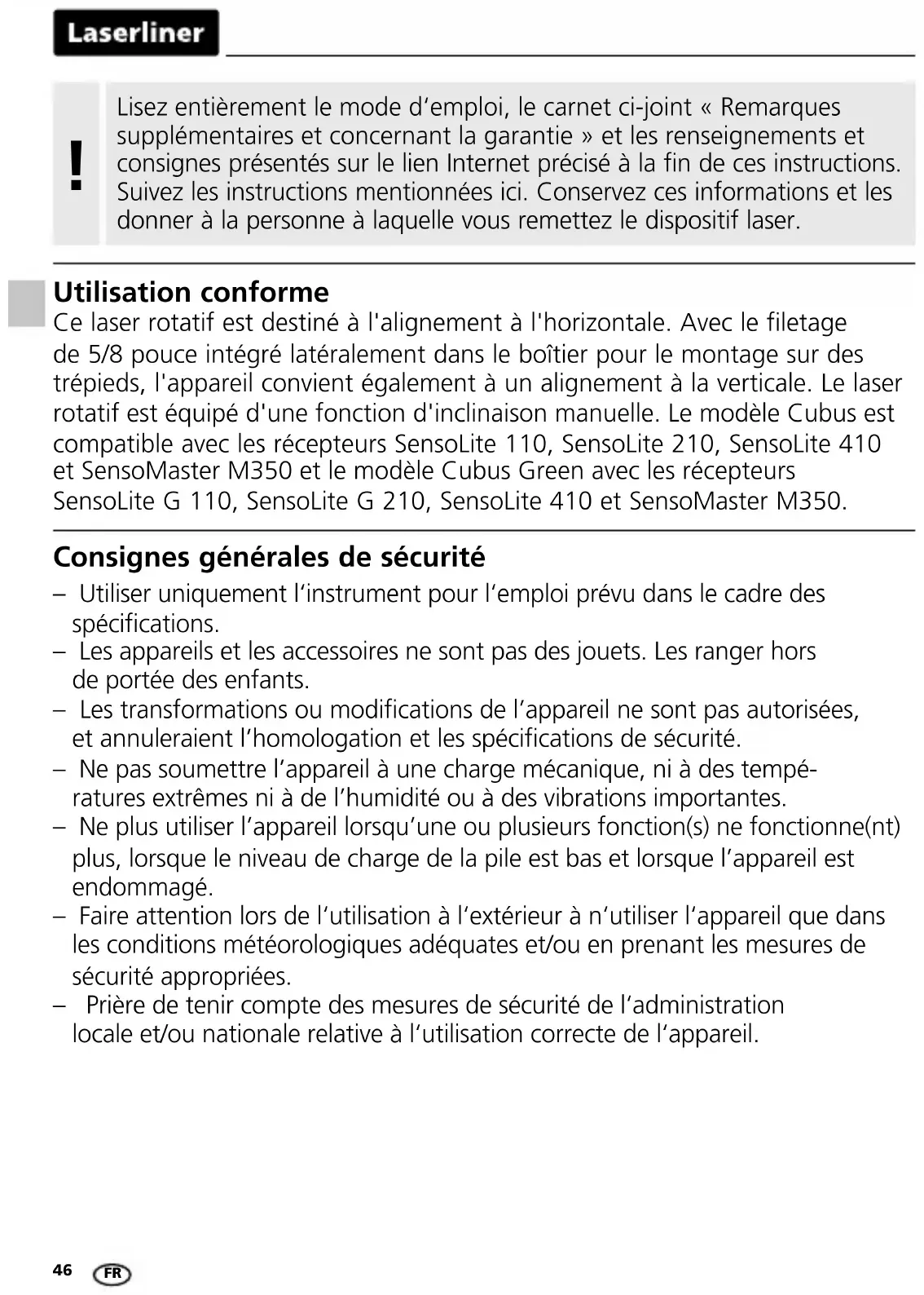væg. Da laseren er placeret nøjagtig midt mellem de 2 vægge, vil markeringerne A1 og A2 være nøjagtig vandret overfor hinanden. Hvis det på X-, Y- eller Z-aksen viser sig, at punkt A2 og A3 ligger mere end 0,15 mm / m fra hinanden, skal der foretages en justering. Indlevér laseren til forhandleren, som sørger for det videre fornødne. !46 Consignes générales de sécurité – Utiliser uniquement l‘instrument pour l‘emploi prévu dans le cadre des spécications. – Les appareils et les accessoires ne sont pas des jouets. Les ranger hors de portée des enfants. – Les transformations ou modications de l’appareil ne sont pas autorisées, et annuleraient l’homologation et les spécications de sécurité. – Ne pas soumettre l’appareil à une charge mécanique, ni à des tempé- ratures extrêmes ni à de l’humidité ou à des vibrations importantes. – Ne plus utiliser l’appareil lorsqu’une ou plusieurs fonction(s) ne fonctionne(nt) plus, lorsque le niveau de charge de la pile est bas et lorsque l’appareil est endommagé. – Faire attention lors de l‘utilisation à l‘extérieur à n‘utiliser l‘appareil que dans les conditions météorologiques adéquates et/ou en prenant les mesures de sécurité appropriées. – Prière de tenir compte des mesures de sécurité de l‘administration locale et/ou nationale relative à l‘utilisation correcte de l‘appareil. Utilisation conforme Ce laser rotatif est destiné à l'alignement à l'horizontale. Avec le filetage de 5/8 pouce intégré latéralement dans le boîtier pour le montage sur des trépieds, l'appareil convient également à un alignement à la verticale. Le laser rotatif est équipé d'une fonction d'inclinaison manuelle. Le modèleCubus est compatible avec les récepteurs SensoLite 110, SensoLite 210, SensoLite 410 et SensoMaster M350 et le modèleCubus Green avec les récepteurs SensoLite G 110, SensoLite G 210, SensoLite 410 et SensoMaster M350. Lisez entièrement le mode d‘emploi, le carnet ci-joint «Remarques supplémentaires et concernant la garantie» et les renseignements et consignes présentés sur le lien Internet précisé à la fin de ces instructions. Suivez les instructions mentionnées ici. Conservez ces informations et les donner à la personne à laquelle vous remettez le dispositif laser.