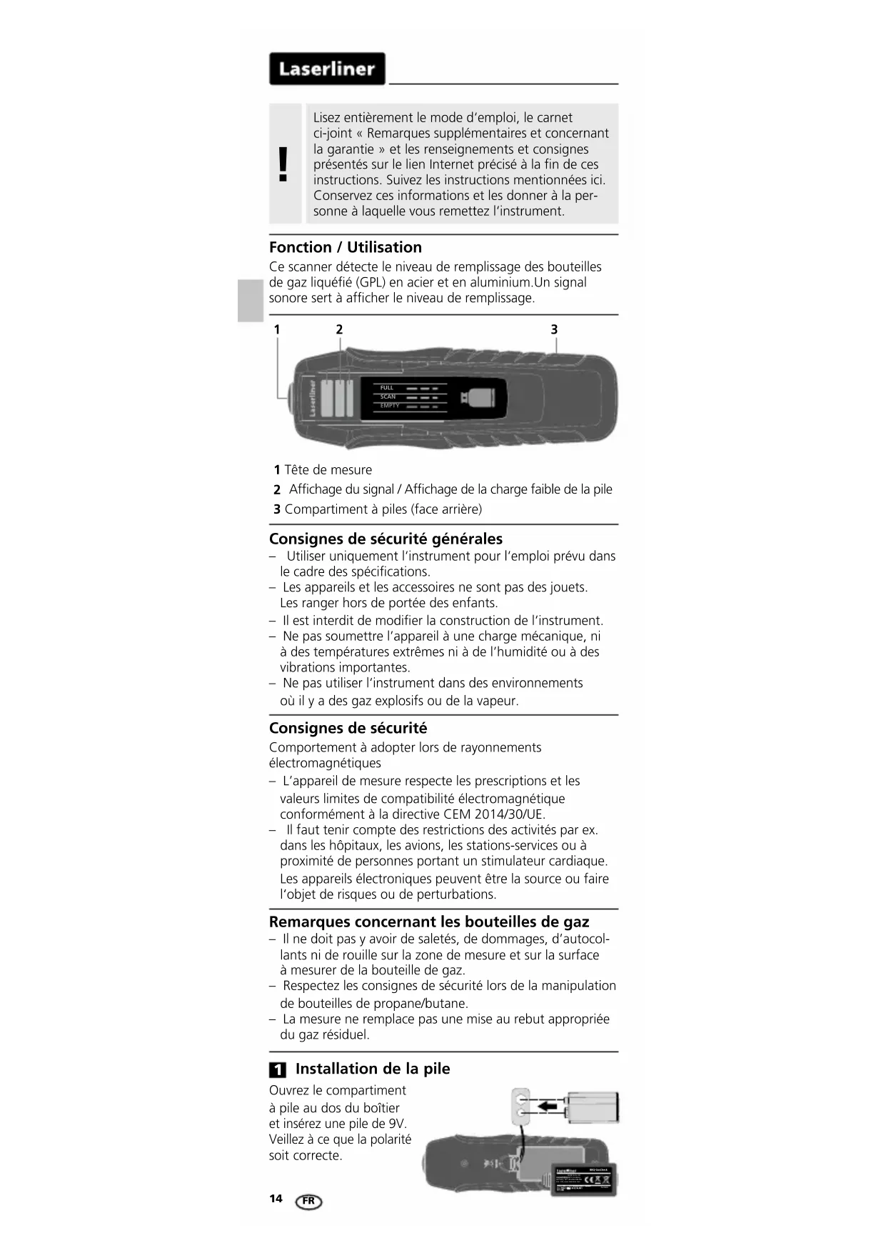 Afchage du signal / Afchage de la charge faible de la pile 3 Compartiment à piles (face arrière) A quality product from GmbH & Co. KGDonnerfeld 2, 59757 ArnsbergGermany, Tel: +49 2932 638-300Fax: -333, www.laserliner.comRev18W24BBQ-GasCheck9V x 1 NEDA1604 / 1604AIEC 006P 6F22/6LR61 Ouvrez le compartiment à pile au dos du boîtier et insérez une pile de 9V. Veillez à ce que la polarité soit correcte.