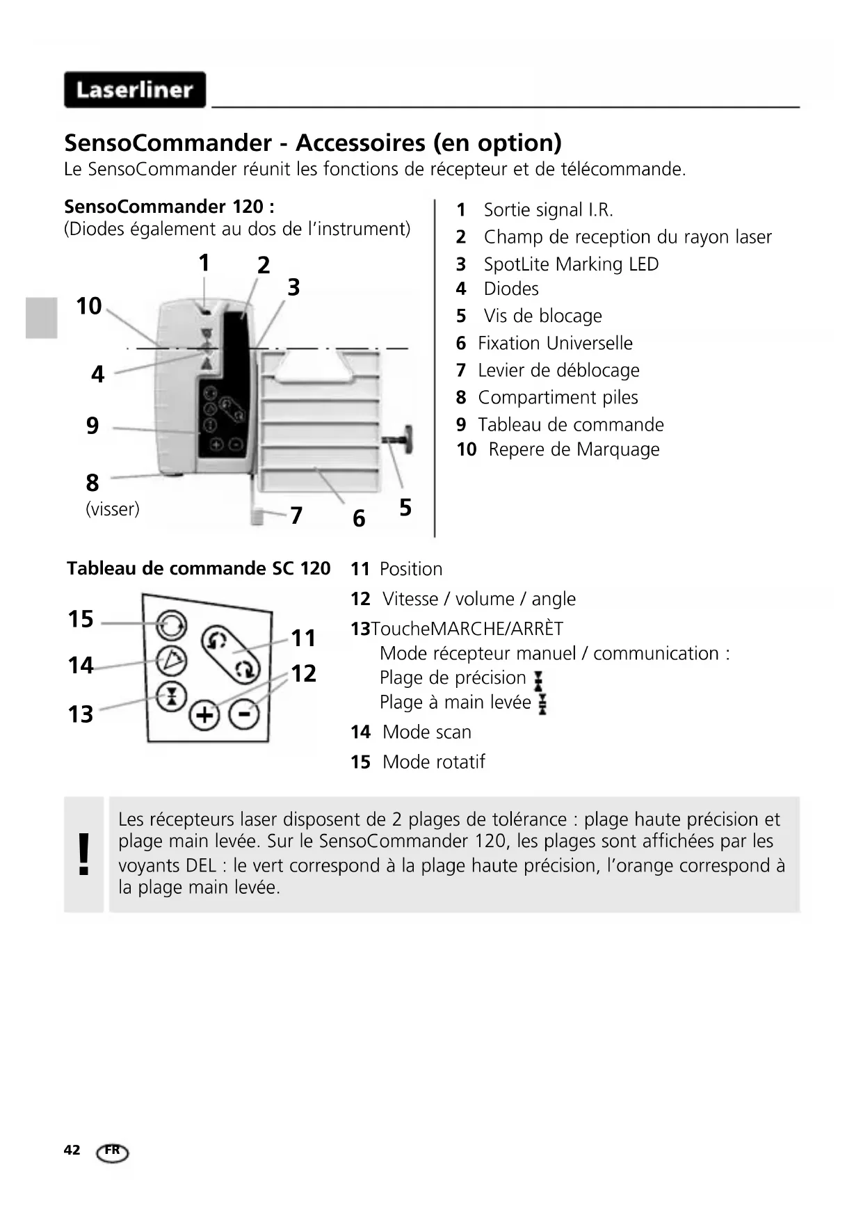 (visser) 1 Sortie signal I.R. 2 Champ de reception du rayon laser 3 SpotLite Marking LED 4 Diodes 5 Vis de blocage 6 Fixation Universelle 7 Levier de déblocage 8 Compartiment piles 9 Tableau de commande 10 Repere de Marquage SensoCommander - Accessoires (en option) Le SensoCommander réunit les fonctions de récepteur et de télécommande. SensoCommander 120 : (Diodes également au dos de l’instrument) Les récepteurs laser disposent de 2 plages de tolérance : plage haute précision et plage main levée. Sur le SensoCommander 120, les plages sont affichées par les voyants DEL : le vert correspond à la plage haute précision, l’orange correspond à la plage main levée.