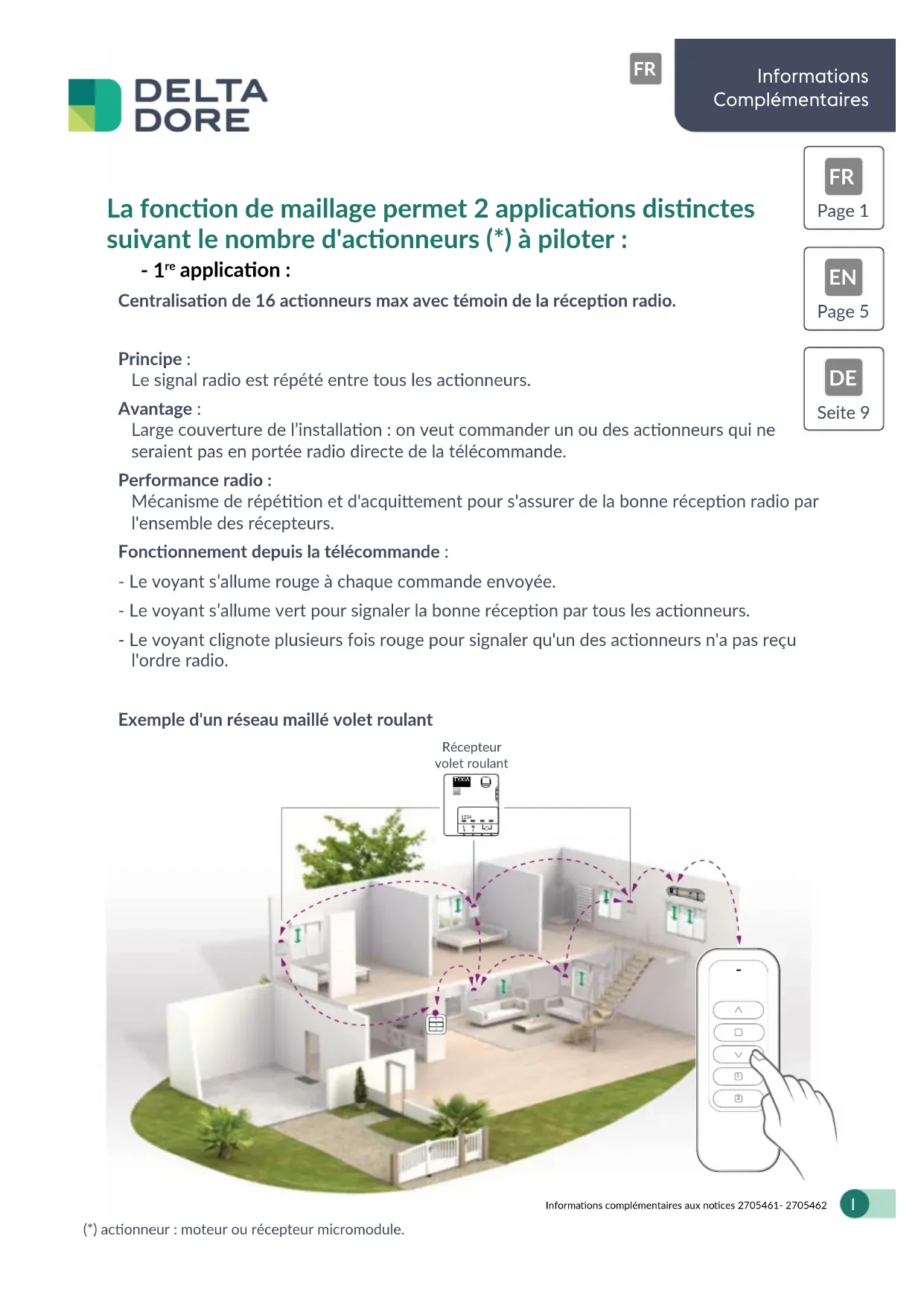 applicaon : Centralisaon de 16 aconneurs max avec témoin de la récepon radio. Principe : Le signal radio est répété entre tous les aconneurs. Avantage : Large couverture de l’installaon : on veut commander un ou des aconneurs qui ne seraient pas en portée radio directe de la télécommande. Performance radio : Mécanisme de répéon et d'acquiement pour s'assurer de la bonne récepon radio par l'ensemble des récepteurs. Fonconnement depuis la télécommande : - Le voyant s’allume rouge à chaque commande envoyée. - Le voyant s’allume vert pour signaler la bonne récepon par tous les aconneurs. - Le voyant clignote plusieurs fois rouge pour signaler qu'un des aconneurs n'a pas reçu l'ordre radio. Exemple d'un réseau maillé volet roulant Récepteurvolet roulant (*) aconneur : moteur ou récepteur micromodule. Informations Complémentaires Informaons complémentaires aux noces 2705461- 2705462