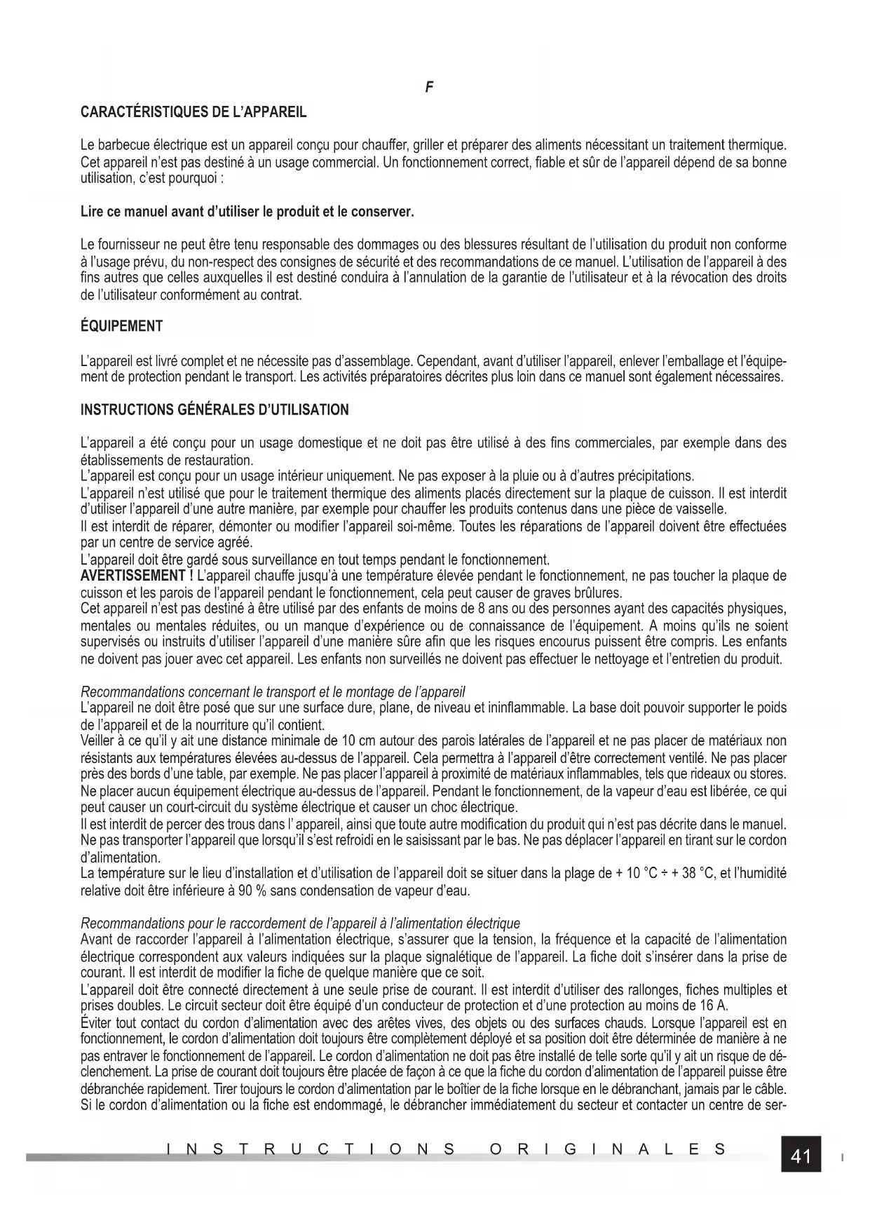 L’appareil a été conçu pour un usage domestique et ne doit pas être utilisé à des fi ns commerciales, par exemple dans des établissements de restauration. L’appareil est conçu pour un usage intérieur uniquement. Ne pas exposer à la pluie ou à d’autres précipitations. L’appareil n’est utilisé que pour le traitement thermique des aliments placés directement sur la plaque de cuisson. Il est interdit d’utiliser l’appareil d’une autre manière, par exemple pour chauff er les produits contenus dans une pièce de vaisselle. Il est interdit de réparer, démonter ou modifi er l’appareil soi-même. Toutes les réparations de l’appareil doivent être eff ectuées par un centre de service agréé. L’appareil doit être gardé sous surveillance en tout temps pendant le fonctionnement. AVERTISSEMENT ! L’appareil chauff e jusqu’à une température élevée pendant le fonctionnement, ne pas toucher la plaque de cuisson et les parois de l’appareil pendant le fonctionnement, cela peut causer de graves brûlures. Cet appareil n’est pas destiné à être utilisé par des enfants de moins de 8 ans ou des personnes ayant des capacités physiques, mentales ou mentales réduites, ou un manque d’expérience ou de connaissance de l’équipement. A moins qu’ils ne soient supervisés ou instruits d’utiliser l’appareil d’une manière sûre afi n que les risques encourus puissent être compris. Les enfants ne doivent pas jouer avec cet appareil. Les enfants non surveillés ne doivent pas eff ectuer le nettoyage et l’entretien du produit. Recommandations concernant le transport et le montage de l’appareil L’appareil ne doit être posé que sur une surface dure, plane, de niveau et ininfl ammable. La base doit pouvoir supporter le poids de l’appareil et de la nourriture qu’il contient. Veiller à ce qu’il y ait une distance minimale de 10 cm autour des parois latérales de l’appareil et ne pas placer de matériaux non résistants aux températures élevées au-dessus de l’appareil. Cela permettra à l’appareil d’être correctement ventilé. Ne pas placer près des bords d’une table, par exemple. Ne pas placer l’appareil à proximité de matériaux infl ammables, tels que rideaux ou stores. Ne placer aucun équipement électrique au-dessus de l’appareil. Pendant le fonctionnement, de la vapeur d’eau est libérée, ce qui peut causer un court-circuit du système électrique et causer un choc électrique. Il est interdit de percer des trous dans l’ appareil, ainsi que toute autre modifi cation du produit qui n’est pas décrite dans le manuel. Ne pas transporter l’appareil que lorsqu’il s’est refroidi en le saisissant par le bas. Ne pas déplacer l’appareil en tirant sur le cordon d’alimentation. La température sur le lieu d’installation et d’utilisation de l’appareil doit se situer dans la plage de + 10 °C ÷ + 38 °C, et l’humidité relative doit être inférieure à 90 % sans condensation de vapeur d’eau. Recommandations pour le raccordement de l’appareil à l’alimentation électrique Avant de raccorder l’appareil à l’alimentation électrique, s’assurer que la tension, la fréquence et la capacité de l’alimentation électrique correspondent aux valeurs indiquées sur la plaque signalétique de l’appareil. La fi che doit s’insérer dans la prise de courant. Il est interdit de modifi er la fi che de quelque manière que ce soit. L’appareil doit être connecté directement à une seule prise de courant. Il est interdit d’utiliser des rallonges, fi ches multiples et prises doubles. Le circuit secteur doit être équipé d’un conducteur de protection et d’une protection au moins de 16 A. Éviter tout contact du cordon d’alimentation avec des arêtes vives, des objets ou des surfaces chauds. Lorsque l’appareil est en fonctionnement, le cordon d’alimentation doit toujours être complètement déployé et sa position doit être déterminée de manière à ne pas entraver le fonctionnement de l’appareil. Le cordon d’alimentation ne doit pas être installé de telle sorte qu’il y ait un risque de dé- clenchement. La prise de courant doit toujours être placée de façon à ce que la fi che du cordon d’alimentation de l’appareil puisse être débranchée rapidement. Tirer toujours le cordon d’alimentation par le boîtier de la fi che lorsque en le débranchant, jamais par le câble. Si le cordon d’alimentation ou la fi che est endommagé, le débrancher immédiatement du secteur et contacter un centre de ser-42 INSTRUCTIONS ORIGINALES