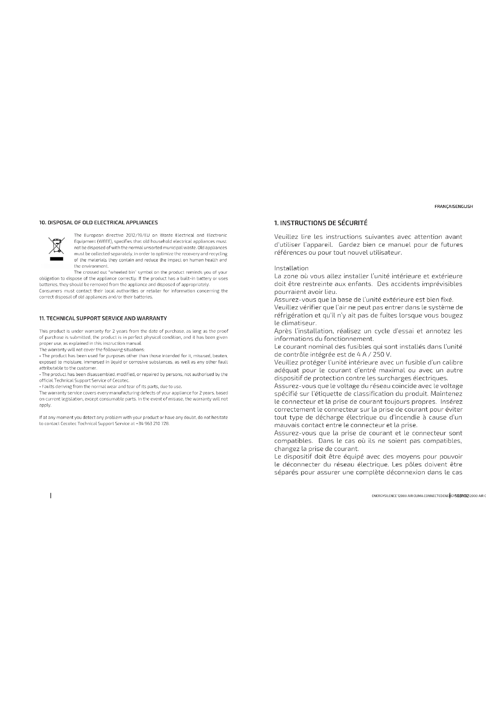 Ce produit possède une garantie de 2 ans à partir de la date d’achat, à condition de toujours présenter la facture d’achat, que le produit soit en parfait état, et ait été utilisé correctement comme indiqué dans ce manuel d’instructions. La garantie ne couvre pas : Un produit qui ait été utilisé en-dehors de ses capacités ou usages normaux, ayant subi des coups, ayant été abîmé, exposé à l’humidité, submergé dans un liquide ou une substance corrosive, ainsi que tous les incidents dont la faute serait imputable au consommateur. Un produit qui ait été démonté, modifié ou réparé par des personnes non autorisées par le Service Après-Vente Officiel de Cecotec. Lorsque le problème a été provoqué par l’usure normale des composants dû à l’utilisation. Le service de garantie couvre tous les défauts de fabrication pendant 2 ans selon la législation en vigueur, à l’exception des pièces consommables. Dans le cas d’une mauvaise utilisation de la part de l’utilisateur, le service de garantie ne se fera pas responsable de la réparation. Si vous détectez un incident ou un problème avec le produit, vous devez contacter le Service Après-Vente Officiel de Cecotec au +34 9 63 21 07 28.ENERGYSILENCE 12000 AIR CLIMA CONNECTEDENERGYSILENCE 12000 AIR CLIMA CONNECTED