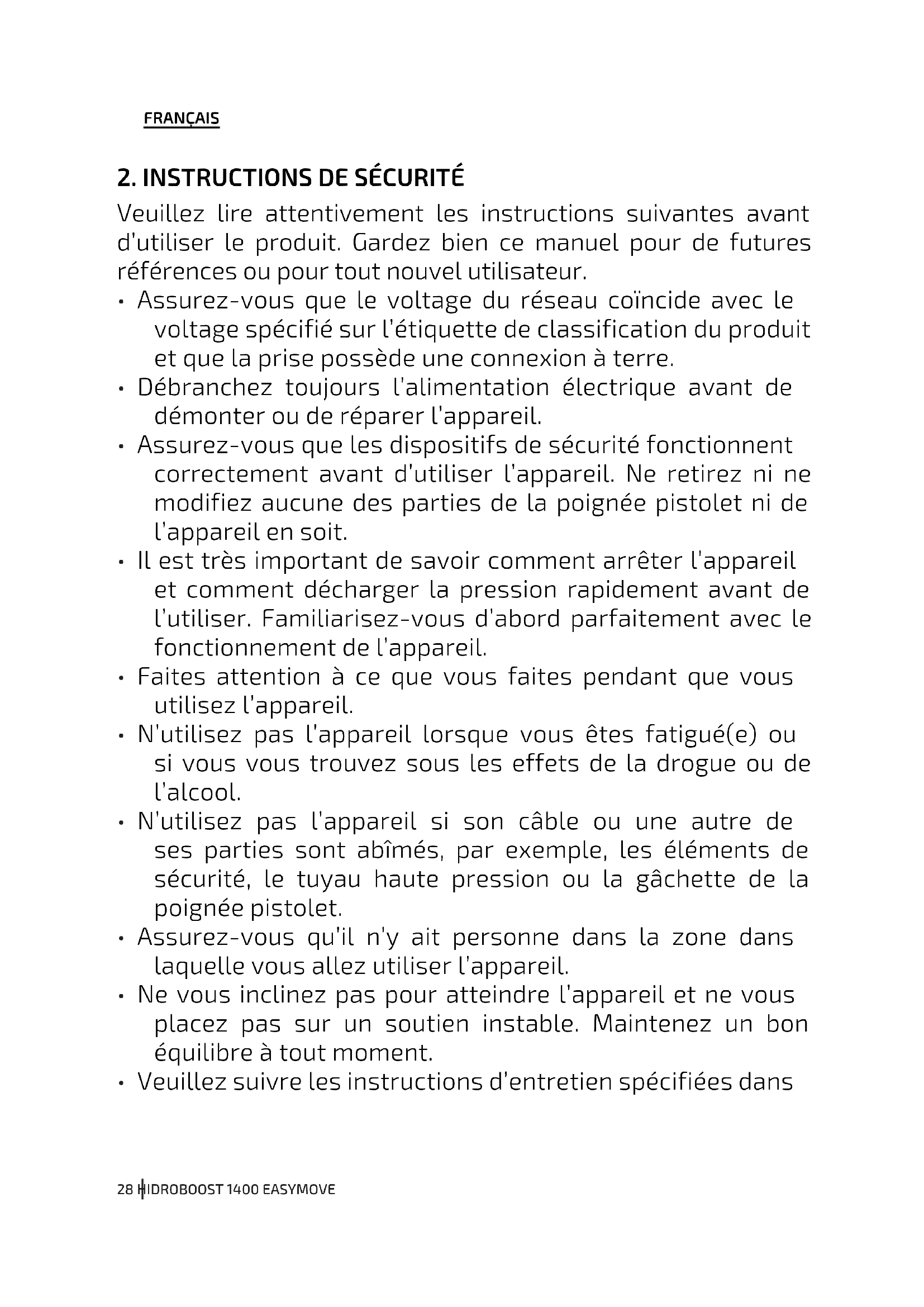 - N’activez pas le système de blocage de la gâchette pendantFRANÇAIS 30 HIDROBOOST 1400 EASYMOVE que l’appareil est en fonctionnement.
