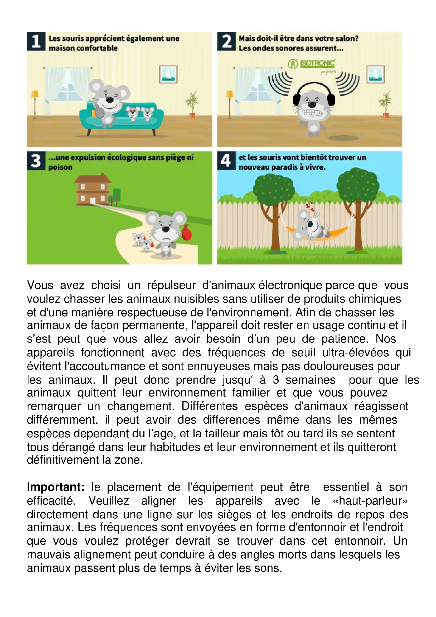 Cher client, Nous vous félicitons de l’achat d’un de nos produits de qualité. Veuillez lire attentivement ces instructions avant d’utiliser l’appareil et conservez- les précieusement. Description du produit La protection Repousseur d’animaux mobile et innovante d'ISOTRONIC. Alimentée par piles, mobile et très efficace. Les visites indésirables de rongeurs dans vos locaux ne vous énerveront plus à l'avenir. Grâce à des ultrasons émis par intervalles, ISOTRONIC Anti-rongeurs garde ces casse-pieds avides de morsures loin de votre maison, jardin, garage, grange, grenier ou gloriette. Prêt à servir, sans connexion électrique ni montage. La commutation d'émission par intervalles de 30 secondes intégrée, évite que le rongeur puisse s'habituer aux ultrasons.Vous avez choisi un répulseur d'animaux électronique parce que vous voulez chasser les animaux nuisibles sans utiliser de produits chimiques et d'une manière respectueuse de l'environnement. Afin de chasser les animaux de façon permanente, l'appareil doit rester en usage continu et il s’est peut que vous allez avoir besoin d’un peu de patience. Nos appareils fonctionnent avec des fréquences de seuil ultra-élevées qui évitent l'accoutumance et sont ennuyeuses mais pas douloureuses pour les animaux. Il peut donc prendre jusqu‘ à 3 semaines pour que les animaux quittent leur environnement familier et que vous pouvez remarquer un changement. Différentes espèces d'animaux réagissent différemment, il peut avoir des differences même dans les mêmes espèces dependant du l’age, et la tailleur mais tôt ou tard ils se sentent tous dérangé dans leur habitudes et leur environnement et ils quitteront définitivement la zone. Important: le placement de l'équipement peut être essentiel à son efficacité. Veuillez aligner les appareils avec le «haut-parleur» directement dans une ligne sur les sièges et les endroits de repos des animaux. Les fréquences sont envoyées en forme d'entonnoir et l'endroit que vous voulez protéger devrait se trouver dans cet entonnoir. Un mauvais alignement peut conduire à des angles morts dans lesquels les animaux passent plus de temps à éviter les sons.L'appareil peut être fixé dans des granges à l'aide des colliers joints ou par des vis. Fonctionnement permanent selon la pile utilisée, d'au moins 12 mois. Fonctionnement Consommation électrique minimale grâce à un nouveau système électronique. L'appareil émet des ultrasons à haute fréquence, à des intervalles et des durées de 30 secondes. Ces sons inaudibles pour l'homme repoussent les rongeurs oints des véhicules et des locaux. Protège contre câbles et autres pièces en caoutchouc. Nous attirons votre attention sur le fait que l’appareil démarre éventuel en mode pause et ne passe qu’ensuite en mode fonctionnement. Il ne s’agit donce pas d’une anomalie. Changement de piles
