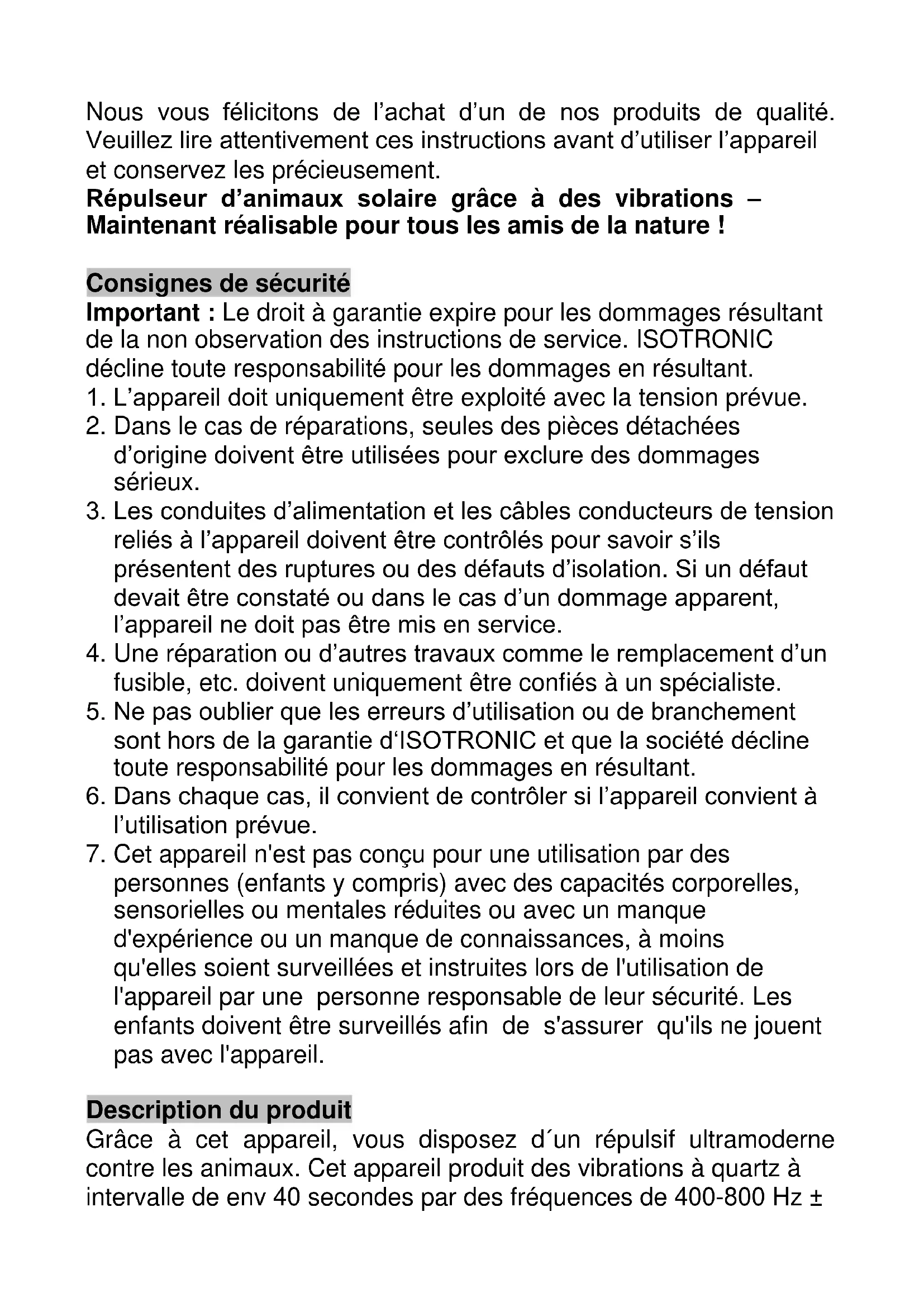 Cher client,Nous vous félicitons de l’achat d’un de nos produits de qualité. Veuillez lire attentivement ces instructions avant d’utiliser l’appareil et conservez les précieusement. Répulseur d’animaux solaire grâce à des vibrations – Maintenant réalisable pour tous les amis de la nature ! Consignes de sécurité Important : Le droit à garantie expire pour les dommages résultant de la non observation des instructions de service. ISOTRONIC décline toute responsabilité pour les dommages en résultant.