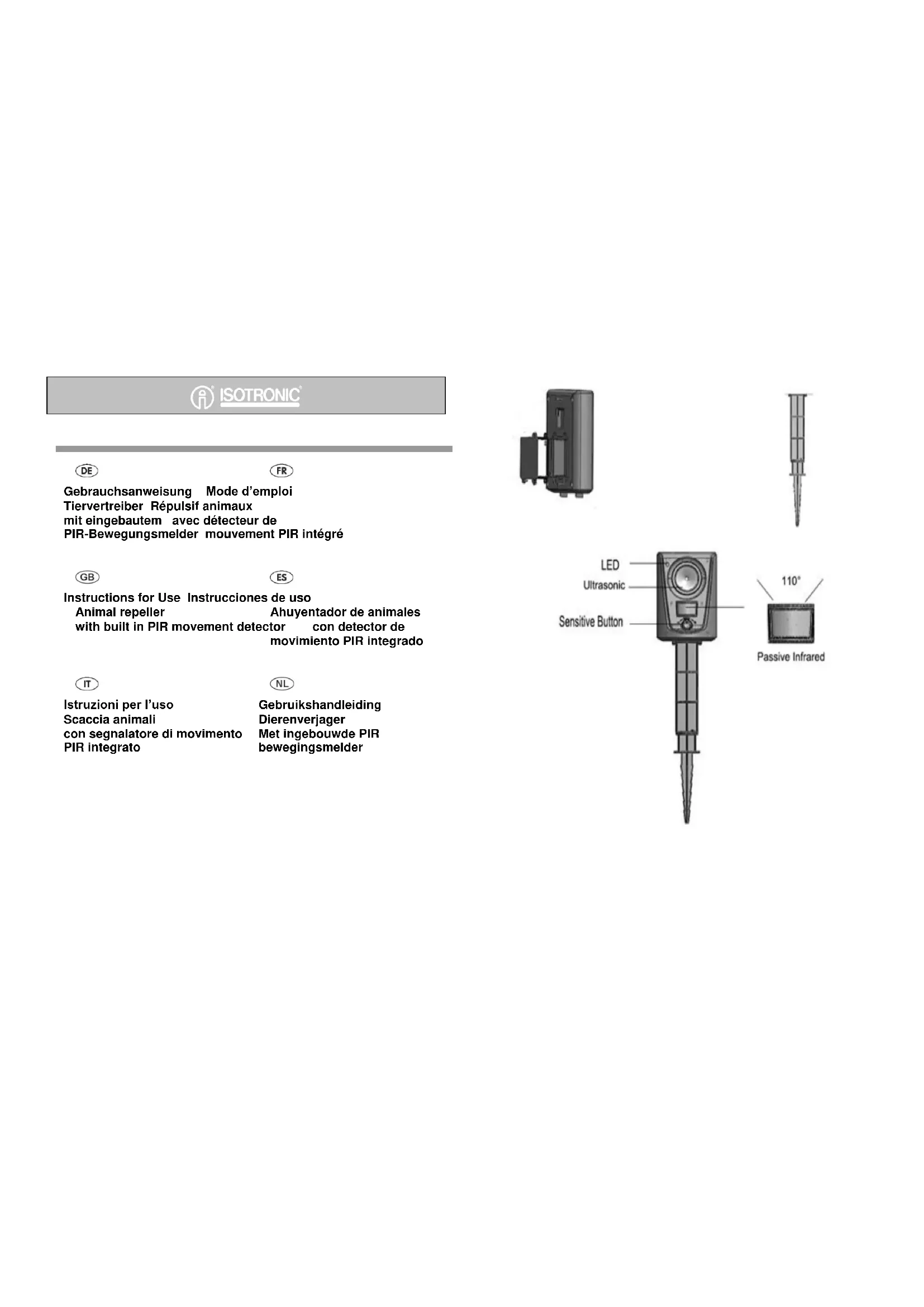 - Recommandations sur le recyclage des piles: Les piles sont soumises à des réglementations législatives. Aussi, vous devez après utilisation rapporter vos piles usagées soit au magasin de vente, soit à un point de collecte des filières de recyclage des services publiques agrées. Vous ne devez en aucun cas jeter vos piles usagées dans les ordures ménagères, dans les sacs jaunes ou semblables. Veuillez vous assurer, avant de jeter vos piles usagées dans les containers de collecte, qu´elles soient déchargées et qu´elles soient protégées contre un potentiel court- circuit (par exemple, en collant les pôles). Zone de détection du détecteur de mouvement PIR Les informations suivantes relatives au détecteur de mouvement PIR servent uniquement de référence. Les paramètres variables, tels que par exemple les conditions climatiques ou ambiantes, peuvent avoir une influence négative sur la sensibilité du capteur. Capteur IR : Angle de détection : environ 110° (selon les conditions ambiantes et climatiques) Portée : environ 10 m (selon les conditions ambiantes et climatiques) Temps de réaction : environ 2 sec. Emplacement Pour effrayer les petits animaux tels que les chats, les petits chiens etc., placez l'appareil à une distance comprise entre 50 cm et un mètre du sol, aussi près que possible des oreilles des animaux. L'émission du haut-parleur et la « détection » du capteur de mouvements sont orientées horizontalement. Afin de reconnaître de plus petits animaux et 'élargir la zone de détection, assurez-vous que l'appareil n'est pas orienté vers le bas. Le repousseur d'animaux doit être installé de manière à être orienté de façon optimale vers la zone qui doit être protégée. A l'aide du support mural ou de la colonne montante, l'appareil peut être fixé au mur d'une maison, à un poteau en bois ou sur un sous-sol mou. Pour les grands jardinsavec une forte végétation, plusieurs appareils peuvent être nécessaires pour assurer une protection suffisante. Mesures de précaution Ne dirigez pas l'appareil vers le domicile de vos voisins ou vers des surfaces ouvertes au public. Il est seulement prévu pour une utilisation sur votre terrain. Le repousseur d'animaux sert à résoudre les problèmes causés par les animaux en liberté, non tenus en laisse ou errants. Il est très efficace sur les chats, les chiens et de nombreux autres animaux. Tenez compte du fait que certaines personnes possédant une oreille sensible exercée à cette fréquence sont en mesure d'entendre l'appareil. Caractéristiques techniques Alimentation par piles :3 x AA Mignon (no inclure) Lieu d‘effet: env. 10 m Fréquence : 16 -60 kHz +/- 10% Fonctionnement avec capteur IR Dès que le capteur enregistre un mouvement, le bruiteur se déclenche et s'arrête environ 10 secondes après que les animaux surpris se sont éloignés de la zone de détection du capteur. Lorsque le capteur PIR n'enregistre aucun mouvement, le bruiteur reste inactif. La DEL est allumée tant que le bruiteur est actif. Consignes de sécurité Important : Le droit à garantie expire pour les dommages résultant de la non observation des instructions de service. ISOTRONIC décline toute responsabilité pour les dommages en résultant. - L’appareil doit uniquement être exploité avec la tension prévue. - Dans le cas de réparations, seules des pièces détachées d’origine doivent être utilisées pour exclure des dommages sérieux. - Les conduites d’alimentation et les câbles conducteurs de tension reliés à l’appareil doivent être contrôlés pour savoir s’ils présentent des ruptures ou des défauts d’isolation. Si un défaut devait être constaté ou dans le cas d’un dommage apparent, l’appareil ne doit pas être mis en service. - Une réparation ou d’autres travaux comme le remplacement d’un fusible, etc. doivent uniquement être confiés à un spécialiste. - Ne pas oublier que les erreurs d’utilisation ou de branchement sont hors de la garantie d‘ISOTRONIC et que la société décline toute responsabilité pour les dommages en résultant. - Dans chaque cas, il convient de contrôler si l’appareil convient à l’utilisation prévue. Consignes générales