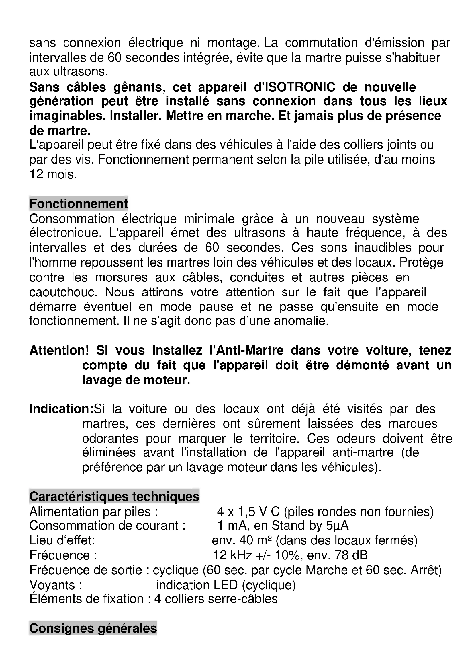 Cher client, Nous vous félicitons de l’achat d’un de nos produits de qualité. Veuillez lire attentivement ces instructions avant d’utiliser l’appareil et conservez- les précieusement. Description du produit La protection anti-martre mobile et innovante d'ISOTRONIC. Alimentée par piles, mobile et très efficace. Les visites indésirables de martres dans vos locaux ne vous énerveront plus à l'avenir. Grâce à des ultrasons émis par intervalles, ISOTRONIC Anti-Martre garde ces casse-pieds avides de morsures loin de votre voiture, maison, garage, grange, grenier ou gloriette. Prêt à servir,sans connexion électrique ni montage. La commutation d'émission par intervalles de 60 secondes intégrée, évite que la martre puisse s'habituer aux ultrasons. Sans câbles gênants, cet appareil d'ISOTRONIC de nouvelle génération peut être installé sans connexion dans tous les lieux imaginables. Installer. Mettre en marche. Et jamais plus de présence de martre. L'appareil peut être fixé dans des véhicules à l'aide des colliers joints ou par des vis. Fonctionnement permanent selon la pile utilisée, d'au moins 12 mois. Fonctionnement Consommation électrique minimale grâce à un nouveau système électronique. L'appareil émet des ultrasons à haute fréquence, à des intervalles et des durées de 60 secondes. Ces sons inaudibles pour l'homme repoussent les martres loin des véhicules et des locaux. Protège contre les morsures aux câbles, conduites et autres pièces en caoutchouc. Nous attirons votre attention sur le fait que l’appareil démarre éventuel en mode pause et ne passe qu’ensuite en mode fonctionnement. Il ne s’agit donc pas d’une anomalie. Attention! Si vous installez l'Anti-Martre dans votre voiture, tenez compte du fait que l'appareil doit être démonté avant un lavage de moteur. Indication:Si la voiture ou des locaux ont déjà été visités par des martres, ces dernières ont sûrement laissées des marques odorantes pour marquer le territoire. Ces odeurs doivent être éliminées avant l'installation de l'appareil anti-martre (de préférence par un lavage moteur dans les véhicules). Caractéristiques techniques Alimentation par piles : 4 x 1,5 V C (piles rondes non fournies) Consommation de courant : 1 mA, en Stand-by 5µA Lieu d‘effet: env. 40 m² (dans des locaux fermés) Fréquence : 12 kHz +/- 10%, env. 78 dB Fréquence de sortie : cyclique (60 sec. par cycle Marche et 60 sec. Arrêt) Voyants : indication LED (cyclique) Éléments de fixation : 4 colliers serre-câbles Consignes générales1. Les appareils électriques, le matériel d’emballage, etc. doivent être tenus hors de portée des enfants.