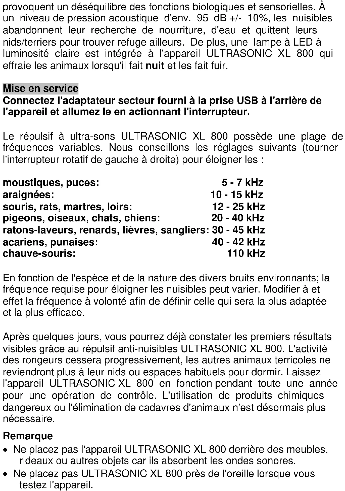 Description du produit Le répulsif ULTRASONIC XL 800 est un appareil très efficace pour faire fuir les souris, les rats, parasites et autres animaux nuisibles. Des analyses en laboratoire ont démontré que les ondes à ultra-sons perturbent le système auditif et nerveux de la plupart des nuisibles etprovoquent un déséquilibre des fonctions biologiques et sensorielles. À un niveau de pression acoustique d'env. 95 dB +/- 10%, les nuisibles abandonnent leur recherche de nourriture, d'eau et quittent leurs nids/terriers pour trouver refuge ailleurs. De plus, une lampe à LED à luminosité claire est intégrée à l'appareil ULTRASONIC XL 800 qui effraie les animaux lorsqu'il fait nuit et les fait fuir. Mise en service Connectez l'adaptateur secteur fourni à la prise USB à l'arrière de l'appareil et allumez le en actionnant l'interrupteur. Le répulsif à ultra-sons ULTRASONIC XL 800 possède une plage de fréquences variables. Nous conseillons les réglages suivants (tourner l'interrupteur rotatif de gauche à droite) pour éloigner les : moustiques, puces: 5 - 7 kHz araignées: 10 - 15 kHz souris, rats, martres, loirs: 12 - 25 kHz pigeons, oiseaux, chats, chiens: 20 - 40 kHz ratons-laveurs, renards, lièvres, sangliers: 30 - 45 kHz acariens, punaises: 40 - 42 kHz chauve-souris: 110 kHz En fonction de l'espèce et de la nature des divers bruits environnants; la fréquence requise pour éloigner les nuisibles peut varier. Modifier à et effet la fréquence à volonté afin de définir celle qui sera la plus adaptée et la plus efficace. Après quelques jours, vous pourrez déjà constater les premiers résultats visibles grâce au répulsif anti-nuisibles ULTRASONIC XL 800. L'activité des rongeurs cessera progressivement, les autres animaux terricoles ne reviendront plus à leur nids ou espaces habituels pour dormir. Laissez l'appareil ULTRASONIC XL 800 en fonction pendant toute une année pour une opération de contrôle. L'utilisation de produits chimiques dangereux ou l'élimination de cadavres d'animaux n'est désormais plus nécessaire. Remarque Ne placez pas l'appareil ULTRASONIC XL 800 derrière des meubles, rideaux ou autres objets car ils absorbent les ondes sonores. Ne placez pas ULTRASONIC XL 800 près de l'oreille lorsque vous testez l'appareil.Caractéristiques techniques Interrupteur: ON/OFF Fixation murale: intégrée Fréquence de travail: réglable en continu env. de 5 à 110 kHz Durée d'intervalle: Fréquence env. 3 sec. ON, env. 27 sec. OFF Lumière LED: flash triple pendant la nuit (cellule photoélectrique) en plus de l'émission de fréquences toutes les 54 secondes (double fonction pour un effet maximal) Pression acoustique: env. 95 dB +/- 10 % Rayon d'action: env. 200 m² Modes de fonctionnement: En utilisant l'adaptateur AC/DC fourni (220 V AC/6V DC 500mA) ou/et Fonctionnement avec pile 4 x AA 1,2V 850mA NiMh (rechargeable via adaptateur AC/DC, accus non compris dans la livraison). Lors de l'utilisation via un adaptateur USB, les batteries sont chargées automatiquement (même si l'appareil est en position OFF). Une surcharge des batteries ne peut pas avoir lieu (dans l'appareil protection est intégré). Température de fonctionnement: - 20C° à +50 C° et ≤ 90% R.H. Température de stockage: - 5C° à +50 C° et ≤ 90% R.H. Protection contre les projections d'eau IP45 Affichage LED (contrôle de bon fonctionnement) Position OFF = pas d'indication de LED Position ON = la LED clignote lentement en vert lors de la transmission de la fréquence Affichage niveau de batterie Charge batterie faible (env. < 3.5Volt) = La LED verte clignote rapidement (veuillez charger l'appareil ou l'utiliser avec un adaptateur USB) Le temps de charge se situe entre 8 et 12 heures. Remplacement des piles