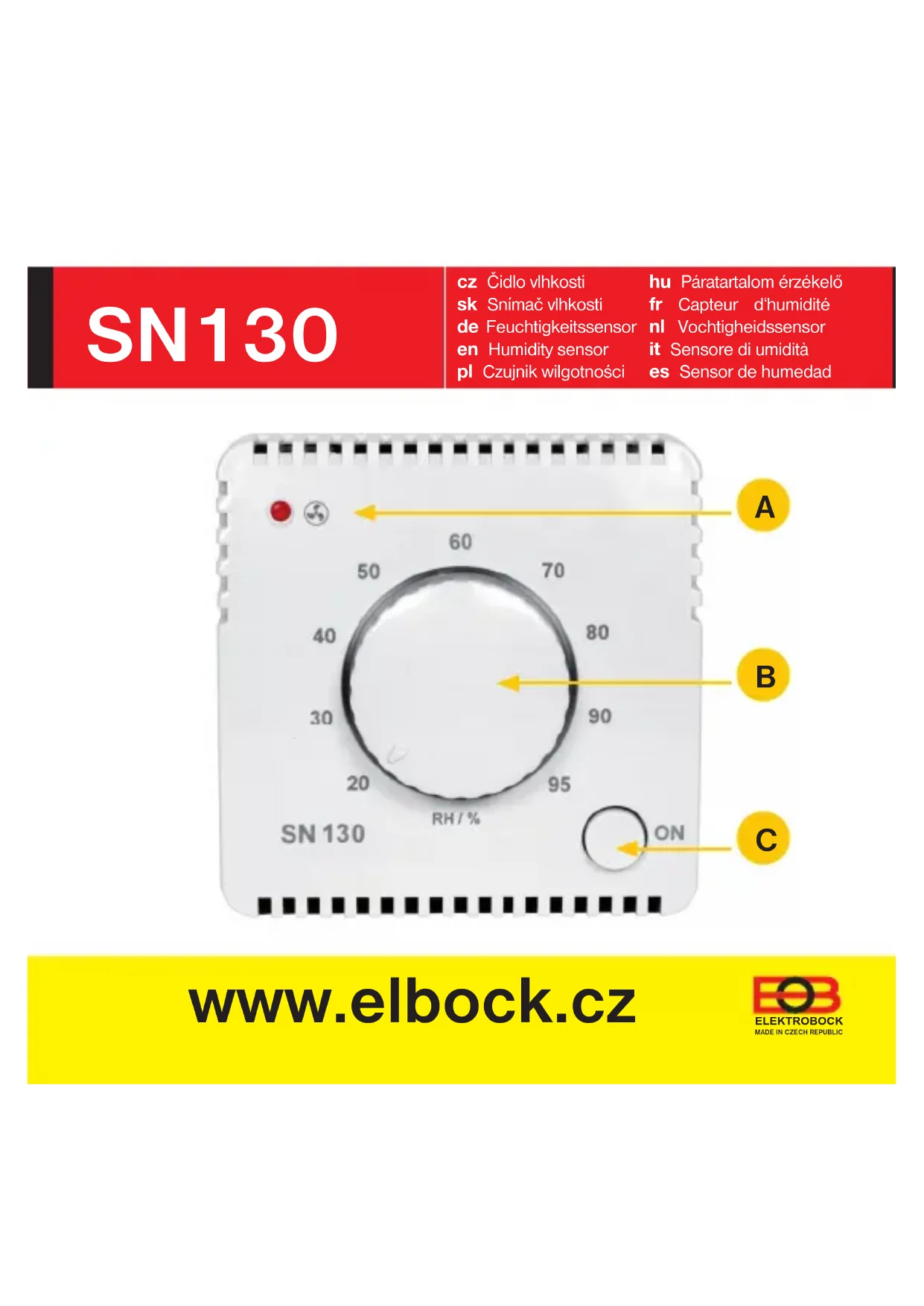 LED jelzés relé kapcsolási jelzés - a működés 10 percre be van kapcsolva (BOOST mód) a működés ki van kapcsolva relé kapcsolási jelzés - a páratartalom túllépte a beállított határértéket Magyar | 14SN130 est un capteur d‘ambiance intérieur avec capteur d‘humidité (hygrostat) conçu pour contrôler des appareils (déshumidifi cateurs, hottes aspirantes, ventilateurs, etc.) d‘un courant maximal de 10 A. Le capteur régule en fonction du taux d‘humidité relative (RH*) de la pièce. C‘est une solution idéale pour les endroits, où il existe un risque élevé de formation de moisissures (sur maçonnerie, fenêtres, carrelage). Une humidité relative élevée peut provoquer la condensation de vapeur d’eau et donc la formation de moisissures. Les moisissures non seulement endommagent les biens, mais peuvent également mettre gravement en danger la santé humaine (allergies, asthme). L‘avantage du SN130 est la fonction manuelle de commutation de charge. En appuyant une fois sur le bouton vous pouvez allumer la charge pendant 10 minutes.