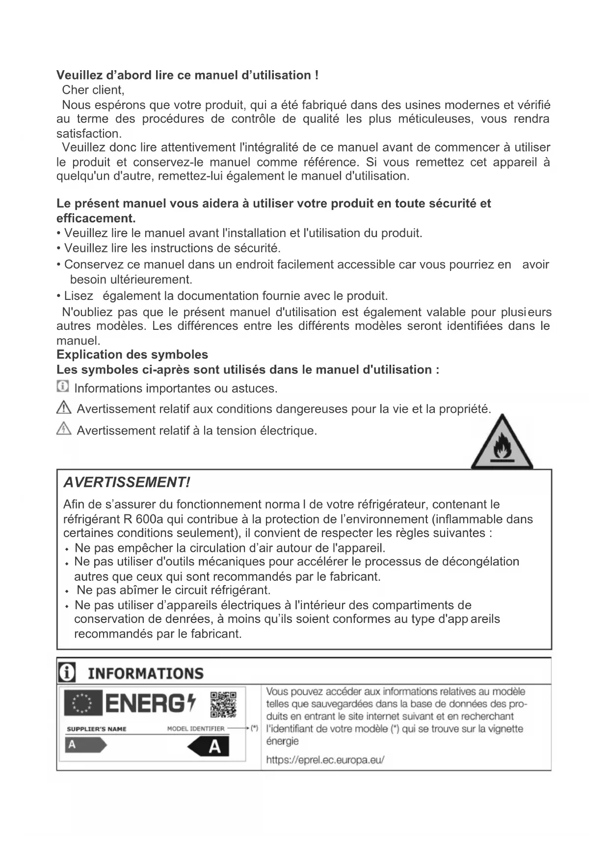 - Lisez également la documentation fournie avec le produit. N'oubliez pas que le présent manuel d'utilisation est également valable pour plusi eurs autres m odèles. Les différences entre les différents modèles seront identifiées dans le manuel. Explication des symboles Les symboles ci-après sont utilisés dans le manuel d'utilisation : Informations importantes ou astuces. Avertissement relatif aux conditions dangereuses pour la vie et la propriété. Avertissement relatif à la tension électrique. AVERTISSEMENT! Afin de s’assurer du fonctionnement norma l de votre réfrigérateur, contenant le réfrigérant R 600a qui contribue à la protection de l’environnement (inflammable dans certaines conditions seulement), il convient de respecter les règles suivantes : Ne pas empêcher la circulation d’air autour de l'appareil.