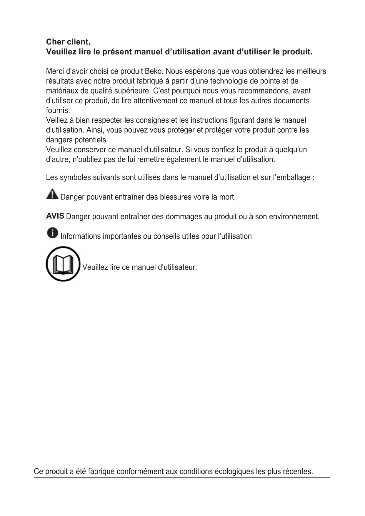 Lave-vaisselle Mode d’emploi 18 7638 0300_BEKO_E9_FR/ 05-04-22.(16:45) BDIN... BDIT... DEN... DFN... DIN... EDDN... EDIN...Les symboles suivants sont utilisés dans le manuel d’utilisation et sur l’emballage : Danger pouvant entraîner des blessures voire la mort. AVIS Danger pouvant entraîner des dommages au produit ou à son environnement. Informations importantes ou conseils utiles pour l’utilisation Veuillez lire ce manuel d’utilisateur. Cher client, Veuillez lire le présent manuel d’utilisation avant d’utiliser le produit. Merci d’avoir choisi ce produit Beko. Nous espérons que vous obtiendrez les meilleurs résultats avec notre produit fabriqué à partir d’une technologie de pointe et de matériaux de qualité supérieure. C’est pourquoi nous vous recommandons, avant d’utiliser ce produit, de lire attentivement ce manuel et tous les autres documents fournis. Veillez à bien respecter les consignes et les instructions figurant dans le manuel d’utilisation. Ainsi, vous pouvez vous protéger et protéger votre produit contre les dangers potentiels. Veuillez conserver ce manuel d’utilisateur. Si vous confiez le produit à quelqu’un d’autre, n’oubliez pas de lui remettre également le manuel d’utilisation. Ce produit a été fabriqué conformément aux conditions écologiques les plus récentes.TABLE DES MATIÈRES