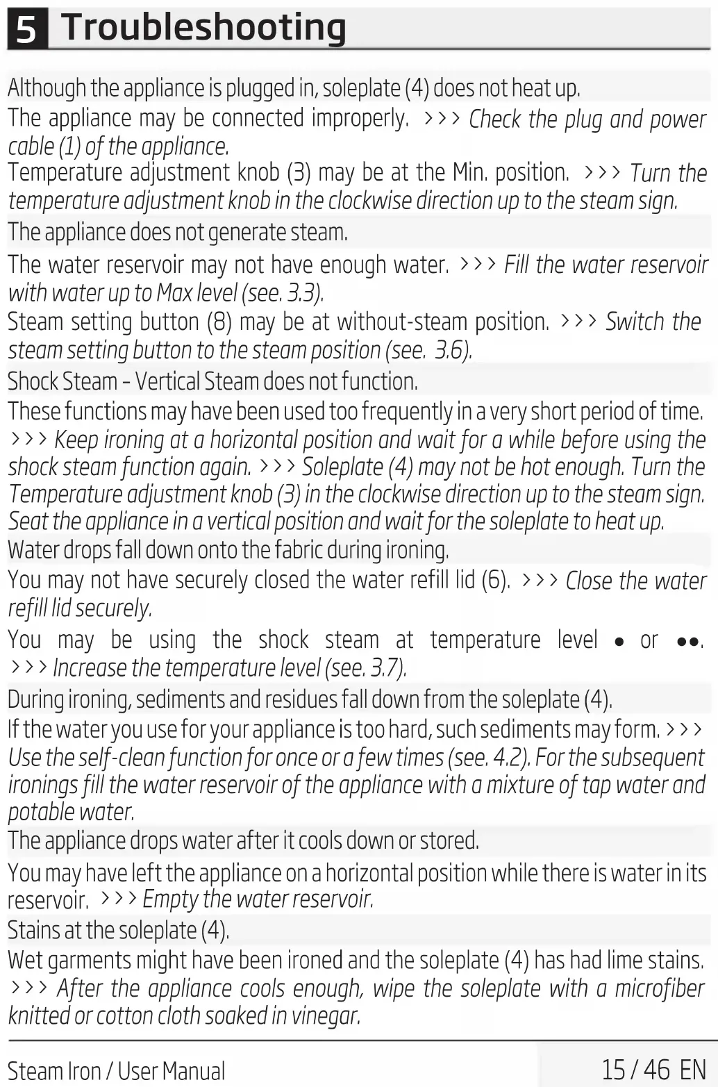 Use the self-clean function for once or a few times (see. 4.2). For the subsequent ironings fill the water reservoir of the appliance with a mixture of tap water and potable water. The appliance drops water after it cools down or stored. You may have left the appliance on a horizontal position while there is water in its reservoir. >>> Empty the water reservoir. Stains at the soleplate (4). Wet garments might have been ironed and the soleplate (4) has had lime stains. >>> After the appliance cools enough, wipe the soleplate with a microfiber knitted or cotton cloth soaked in vinegar.Avant toute chose, veuillez lire ce manuel d'utilisation ! Chers clients, Merci d'avoir choisi les produits Beko. Nous espérons que ce produit, fabriqué dans des installations modernes et soumis à un processus de contrôle qualité rigoureux, vous ore les meilleures performances possibles. C’est pourquoi nous vous recommandons, avant d’utiliser ce produit, de lire attentivement ce manuel et tous les autres documents fournis et de les conserver soigneusement pour toute consultation future. Si vous conez le produit à quelqu’un d’autre, n’oubliez pas de lui remettre également le manuel d’utilisation. Veillez à bien respecter les consignes et les instructions gurant dans le manuel d’utilisation. Signication des symboles Les symboles suivants sont repris tout au long de ce manuel: