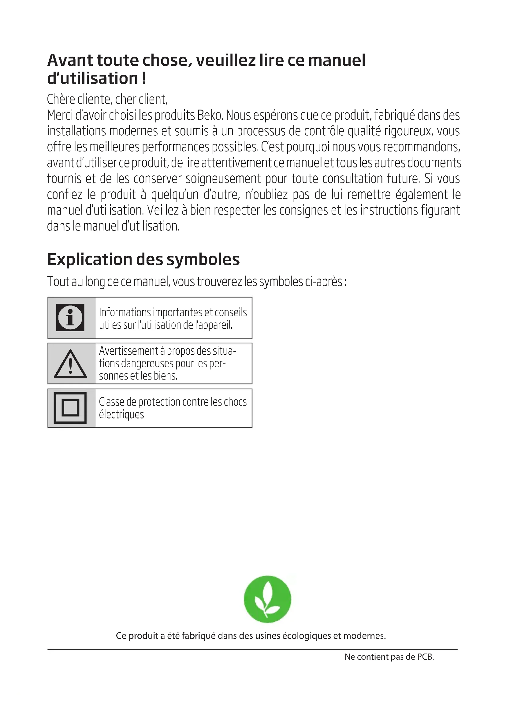 4 การทาความสะอาดและการบารุงรักษาAvant toute chose, veuillez lire ce manuel d'utilisation ! Chère cliente, cher client, Merci d'avoir choisi les produits Beko. Nous espérons que ce produit, fabriqué dans des installations modernes et soumis à un processus de contrôle qualité rigoureux, vous offre les meilleures performances possibles. C’est pourquoi nous vous recommandons, avant d’utiliser ce produit, de lire attentivement ce manuel et tous les autres documents fournis et de les conserver soigneusement pour toute consultation future. Si vous confiez le produit à quelqu’un d’autre, n’oubliez pas de lui remettre également le manuel d’utilisation. Veillez à bien respecter les consignes et les instructions figurant dans le manuel d’utilisation. Explication des symboles Tout au long de ce manuel, vous trouverez les symboles ci-après :