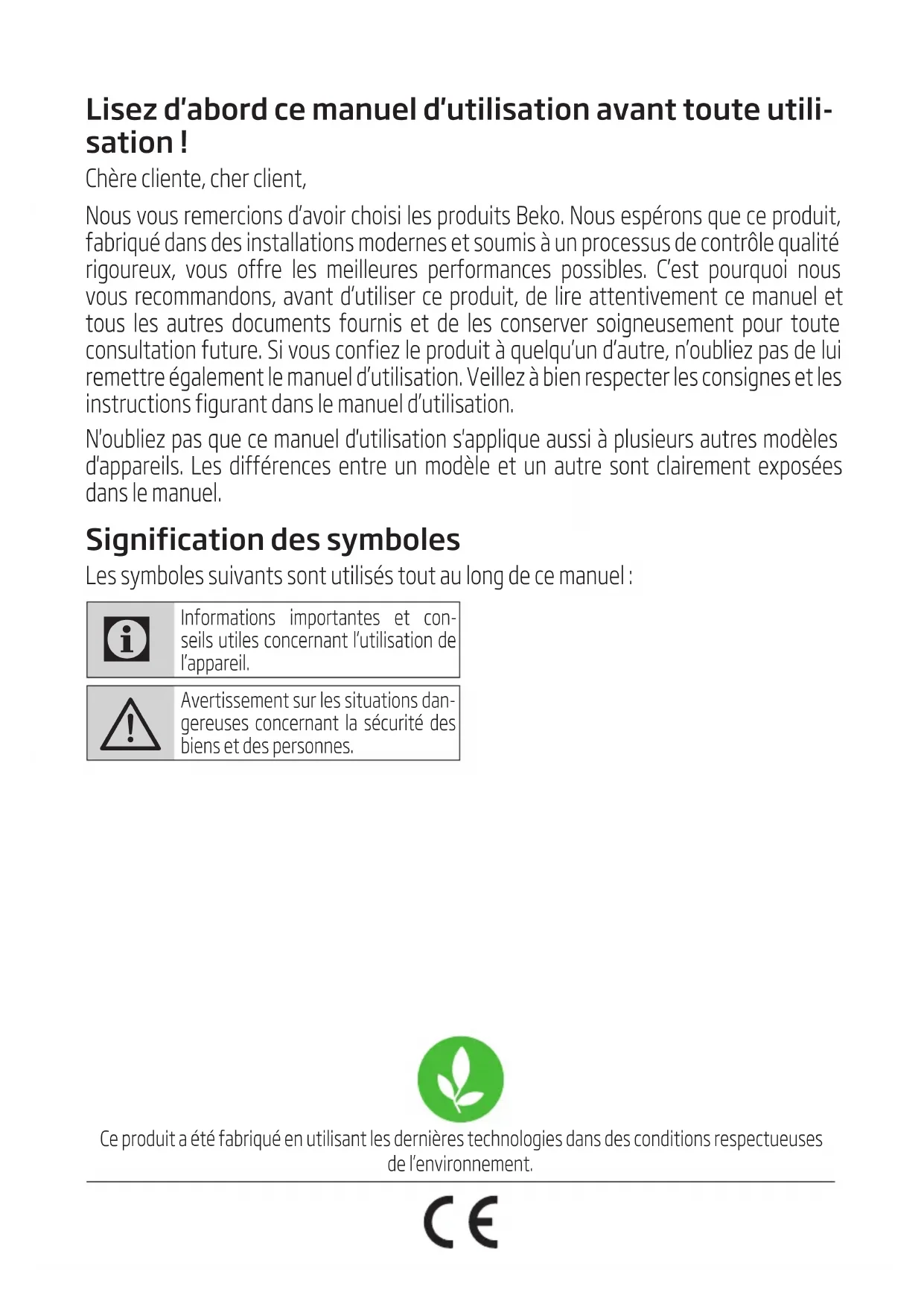 Chère cliente, cher client, Nous vous remercions d’avoir choisi les produits Beko. Nous espérons que ce produit, fabriqué dans des installations modernes et soumis à un processus de contrôle qualité rigoureux, vous offre les meilleures performances possibles. C’est pourquoi nous vous recommandons, avant d’utiliser ce produit, de lire attentivement ce manuel et tous les autres documents fournis et de les conserver soigneusement pour toute consultation future. Si vous confiez le produit à quelqu’un d’autre, n’oubliez pas de lui remettre également le manuel d’utilisation. Veillez à bien respecter les consignes et les instructions figurant dans le manuel d’utilisation. N'oubliez pas que ce manuel d'utilisation s'applique aussi à plusieurs autres modèles d'appareils. Les différences entre un modèle et un autre sont clairement exposées dans le manuel.