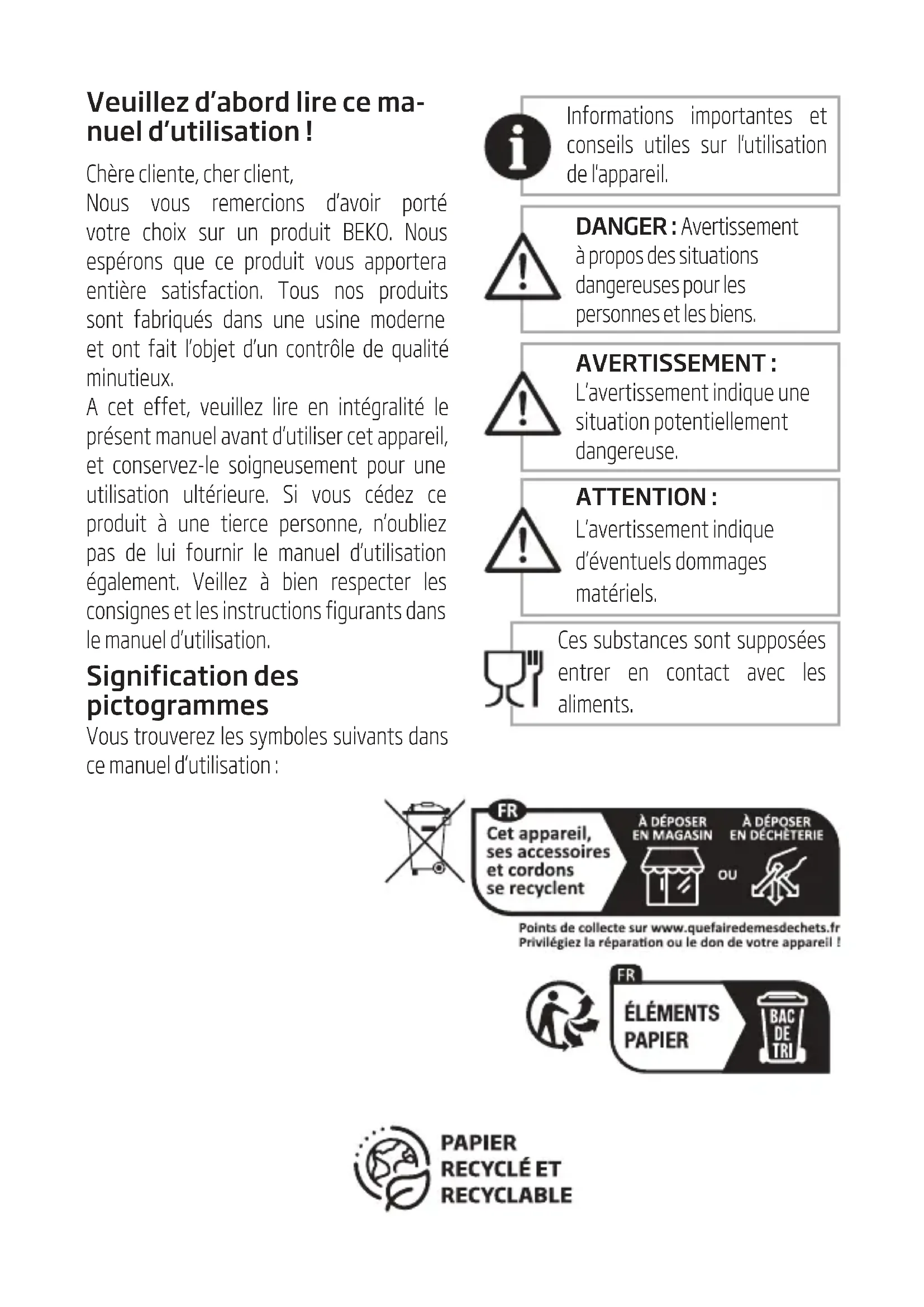 Diese Garantiezusage ist nur gültig innerhalb der Bundesrepublik Deutschland Garantiebedingungen - Beko – Version Februar 2021Veuillez d’abord lire ce ma- nuel d’utilisation ! Chère cliente, cher client, Nous vous remercions d’avoir porté votre choix sur un produit BEKO. Nous espérons que ce produit vous apportera entière satisfaction. Tous nos produits sont fabriqués dans une usine moderne et ont fait l’objet d’un contrôle de qualité minutieux. A cet effet, veuillez lire en intégralité le présent manuel avant d’utiliser cet appareil, et conservez-le soigneusement pour une utilisation ultérieure. Si vous cédez ce produit à une tierce personne, n’oubliez pas de lui fournir le manuel d’utilisation également. Veillez à bien respecter les consignes et les instructions figurants dans le manuel d’utilisation. Signification des pictogrammes Vous trouverez les symboles suivants dans ce manuel d’utilisation : Informatons mportantes et consels utles sur l'utlsaton de l'apparel.