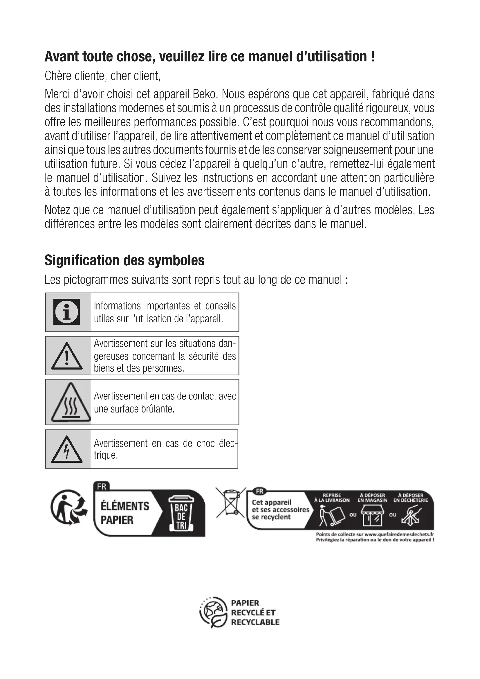 ITALIANO 20-37 ČESKY 38-55 POLSKI 56-76 ROMÂNĂ 77-98Avant toute chose, veuillez lire ce manuel d’utilisation ! Chère cliente, cher client, Merci d’avoir choisi cet appareil Beko. Nous espérons que cet appareil, fabriqué dans des installations modernes et soumis à un processus de contrôle qualité rigoureux, vous offre les meilleures performances possible. C’est pourquoi nous vous recommandons, avant d’utiliser l’appareil, de lire attentivement et complètement ce manuel d’utilisation ainsi que tous les autres documents fournis et de les conserver soigneusement pour une utilisation future. Si vous cédez l’appareil à quelqu’un d’autre, remettez-lui également le manuel d’utilisation. Suivez les instructions en accordant une attention particulière à toutes les informations et les avertissements contenus dans le manuel d’utilisation. Notez que ce manuel d’utilisation peut également s’appliquer à d’autres modèles. Les différences entre les modèles sont clairement décrites dans le manuel. Signification des symboles Les pictogrammes suivants sont repris tout au long de ce manuel :