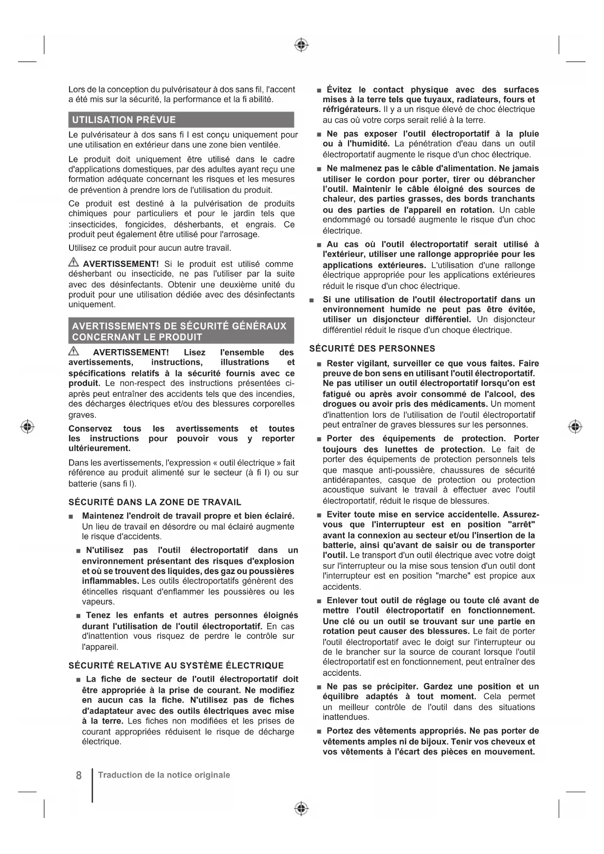 Le pulvérisateur à dos sans fi l est conçu uniquement pour une utilisation en extérieur dans une zone bien ventilée. Le produit doit uniquement être utilisé dans le cadre d'applications domestiques, par des adultes ayant reçu une formation adéquate concernant les risques et les mesures de prévention à prendre lors de l'utilisation du produit. Ce produit est destiné à la pulvérisation de produits chimiques pour particuliers et pour le jardin tels que :insecticides, fongicides, désherbants, et engrais. Ce produit peut également être utilisé pour l'arrosage. Utilisez ce produit pour aucun autre travail. AVERTISSEMENT! Si le produit est utilisé comme désherbant ou insecticide, ne pas l'utiliser par la suite avec des désinfectants. Obtenir une deuxième unité du produit pour une utilisation dédiée avec des désinfectants uniquement. AVERTISSEMENTS DE SÉCURITÉ GÉNÉRAUX