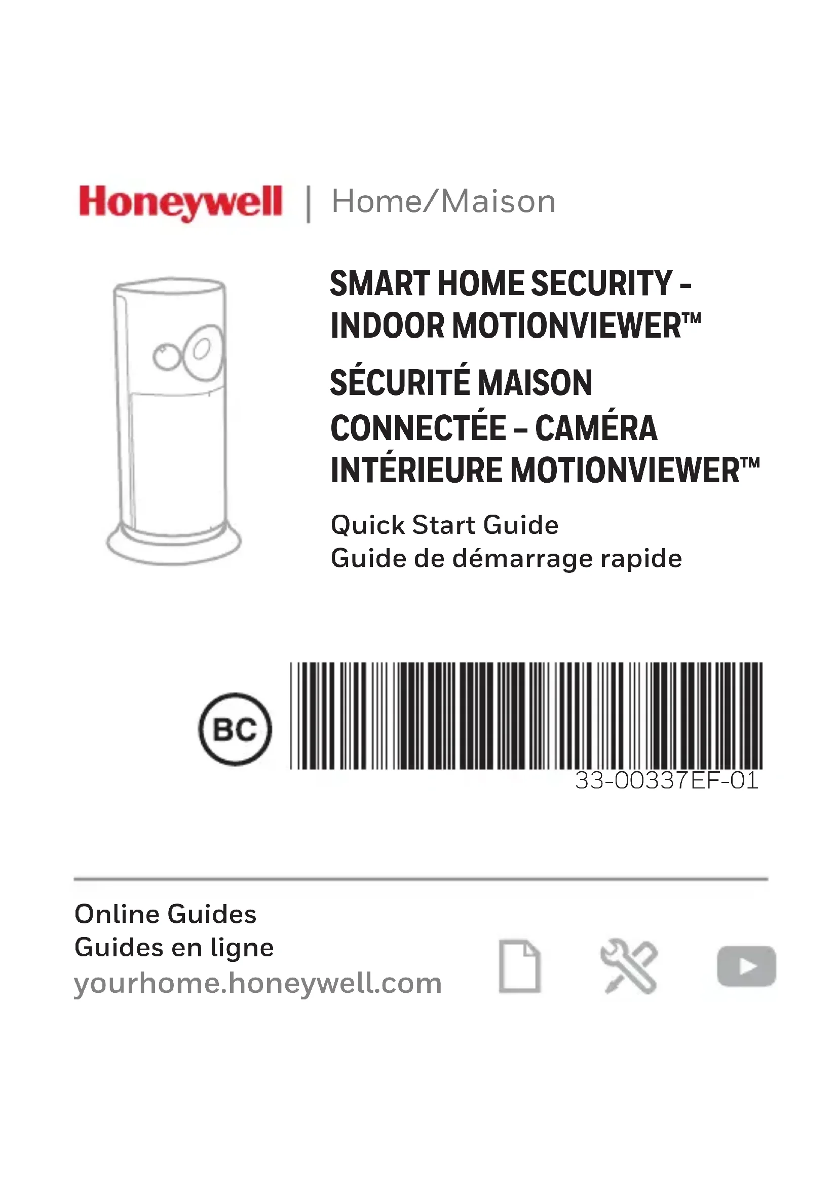 Quick Start Guide Guide de démarrage rapide Online Guides Guides en ligne yourhome.honeywell.com Home/Maison 33-00337EF-01FCC Regulations § 15.19 (a)(3) This device complies with part 15 of the FCC Rules. Operation is subject to the following two conditions: (1) This device may not cause harmful interference, and (2) this device must accept any interference received, including interference that may cause undesired operation. § 15.21 Changes or modifications not expressly approved by the party responsible for compliance could void the user’s authority to operate the equipment. 47 CFR § 15.105 (b) See https://customer.honeywell.com/enUS/support/residential/codes- and-standards/FCC15105/Pages/default.aspx for additional FCC information for this product. FCC Radiation Exposure Statement: This equipment complies with FCC radiation exposure limits set forth for an uncontrolled environment. This equipment should be installed and operated with minimum distance 20cm between the radiator & your body. IC Regulations This device complies with Industry Canada license-exempt RSS standard(s). Operation is subject to the following two conditions: (1) this device may not cause interference, and (2) this device must accept any interference, including interference that may cause undesired operation of the device. IC Radiation Exposure Statement: This equipment complies with IC RSS102 radiation exposure limits set forth for an uncontrolled environment. This equipment should be installed and operated with minimum distance 20cm between the radiator & your body.Règlements de la FCC § 15.19 (a)(3) Cet appareil est conforme à la partie 15 du règlement de la FCC. Son fonctionnement est soumis aux deux conditions suivantes : (1) l’appareil ne doit pas produire de brouillage; (2) l’appareil doit accepter tout brouillage radioélectrique subi, même si le brouillage est susceptible d’en compromettre le fonctionnement. § 15.21 Les modifications qui ne sont pas expressément autorisées par la partie responsable de la conformité peuvent annuler la capacité de l’utilisateur à utiliser l’équipement. Déclaration de la FCC sur l’exposition aux rayonnements : Cet équipement est conforme aux limites d’exposition aux rayonnements établies par la FCC pour un environnement non contrôlé. Celui-ci doit être installé et utilisé avec un minimum de 20 cm de distance entre la source de rayonnement et votre corps. Règlements d’IC Cet appareil est conforme aux CNR d’Industrie Canada applicables aux appareils radio exempts de licence. Son fonctionnement est soumis aux deux conditions suivantes : (1) ce dispositif ne peut pas causer d’interférences, et (2) ce dispositif doit accepter toutes les interférences reçues, notamment celles à l’origine d’un fonctionnement indésirable. Déclaration d’IC sur l’exposition aux rayonnements : Cet équipement est conforme aux limites d’exposition aux rayonnements établies pour un environnement non contrôlé dans la norme CNR102 d’IC. Celui-ci doit être installé et utilisé avec un minimum de 20 cm de distance entre la source de rayonnement et votre corps.Your Honeywell Home app must be used to install and configure this sensor. You need to install the app first. If your system is already installed, open your Honeywell Home app to install the sensor. Vous devez utiliser votre application Honeywell Home pour installer et configurer ce détecteur. Vous devez premièrement installer l’application. Si le système est déjà installé, ouvrez l’application Honeywell Home pour installer ce détecteur. Please wait to pull the tab on the sensor until you are instructed by the app. Veuillez attendre l’invite de l’application avant de tirer sur la languette du détecteur. Before you install your Indoor MotionViewer™... Avant d’installer la caméra intérieure MotionViewer™... Honeywell | Home 1985 Douglas Dr N Golden Valley, MN 55422 1-800-633-3991 ® U.S. Registered Trademark. © 2018 Honeywell International Inc. 33-00337EF—01 M.S. 07-18 Printed in U.S.A.