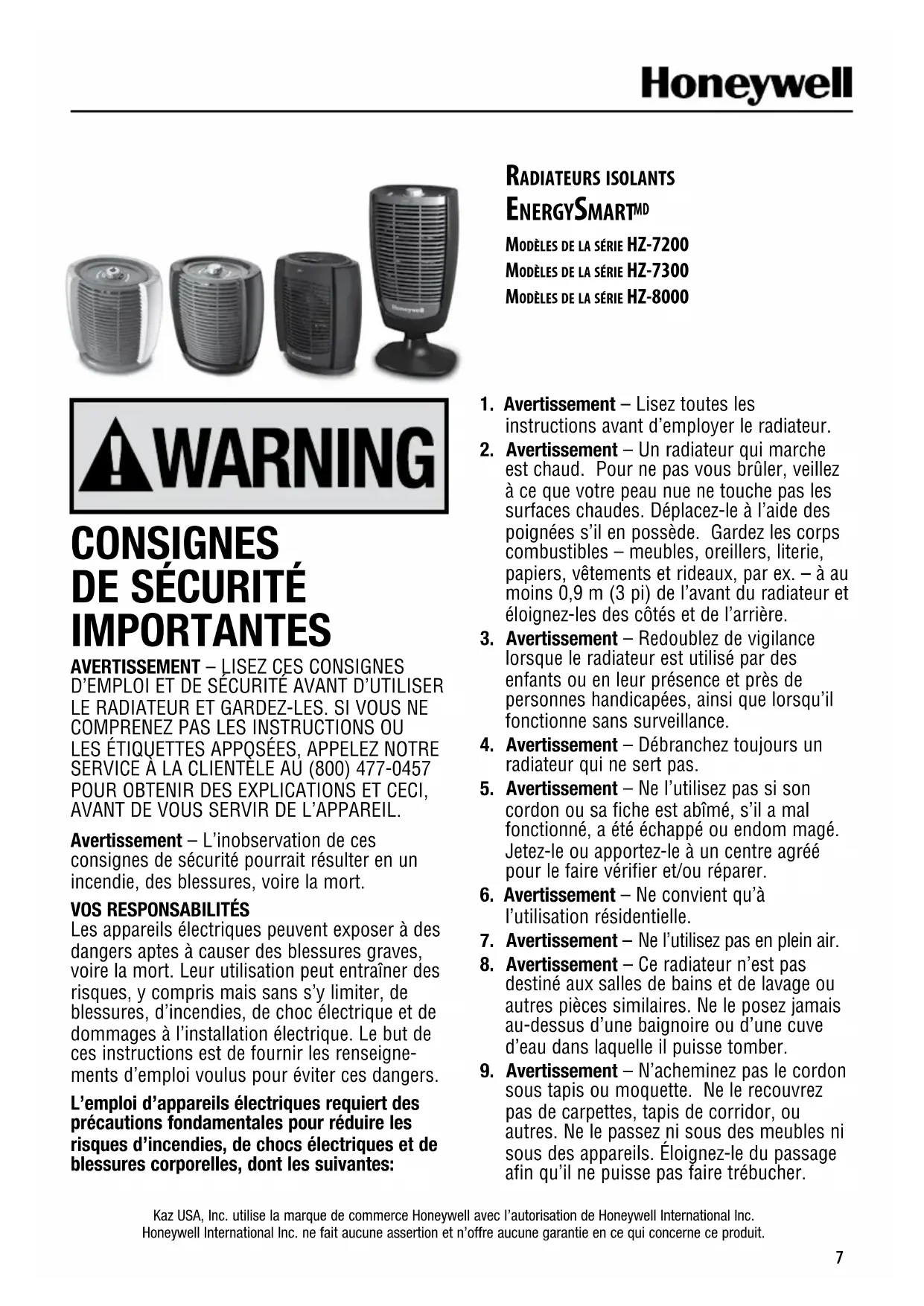 modèlES dE la SériE hZ-7200 modèlES dE la SériE hZ-7300 modèlES dE la SériE hZ-8000 Kaz USA, Inc. utilise la marque de commerce Honeywell avec l’autorisation de Honeywell International Inc.Honeywell International Inc. ne fait aucune assertion et n’offre aucune garantie en ce qui concerne ce produit.8