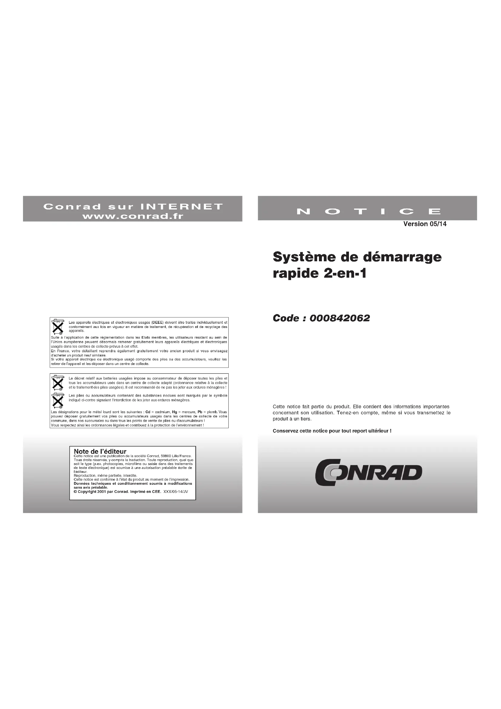 Note de l’éditeur Cette notice est une publication de la société Conrad, 59800 Lille/France.Tous droits réservés, y compris la traduction. Toute reproduction, quel que soit le type (p.ex. photocopies, microfilms ou saisie dans des traitements de texte électronique) est soumise à une autorisation préalable écrite de l’éditeur.Reproduction, même partielle, interdite.Cette notice est conforme à l’état du produit au moment de l’impression.Données techniques et conditionnement soumis à modifications sans avis préalable.© Copyright 2001 par Conrad. Imprimé en CEE. XXX/05-14/JV Système de démarrage rapide 2-en-1 Code : 000842062 Cette notice fait partie du produit. Elle contient des informations importantes concernant son utilisation. Tenez-en compte, même si vous transmettez le produit à un tiers. Conservez cette notice pour tout report ultérieur ! NOTICE Conrad sur INTERNET www.conrad.fr Version 05/14 Les appareils électriques et électroniques usagés (DEEE) doivent être traités individuellement et conformément aux lois en vigueur en matière de traitement, de récupération et de recyclage des appareils.Suite à l’application de cette réglementation dans les Etats membres, les utilisateurs résidant au sein de l’Union européenne peuvent désormais ramener gratuitement leurs appareils électriques et électroniques usagés dans les centres de collecte prévus à cet effet.En France, votre détaillant reprendra également gratuitement votre ancien produit si vous envisagez d’acheter un produit neuf similaire.Si votre appareil électrique ou électronique usagé comporte des piles ou des accumulateurs, veuillez les retirer de l’appareil et les déposer dans un centre de collecte.Le décret relatif aux batteries usagées impose au consommateur de déposer toutes les piles et tous les accumulateurs usés dans un centre de collecte adapté (ordonnance relative à la collecte et le traitement des piles usagées). Il est recommandé de ne pas les jeter aux ordures ménagères !Les piles ou accumulateurs contenant des substances nocives sont marqués par le symbole indiqué ci-contre signalant l’interdiction de les jeter aux ordures ménagères. Les désignations pour le métal lourd sont les suivantes : Cd = cadmium, Hg = mercure, Pb = plomb. Vous pouvez déposer gratuitement vos piles ou accumulateurs usagés dans les centres de collecte de votre commune, dans nos succursales ou dans tous les points de vente de piles ou d'accumulateurs !Vous respectez ainsi les ordonnances légales et contribuez à la protection de l’environnement !2 7 Caractéristiques techniques - Pour batteries 12/24 V - 1 prise 12 V - Avec poignée intégrée et affichage du statut de charge - Aide au démarrage 12 V : 900 A - Aide au démarrage 24 V : 1500 A - Capacité de la batterie : 2 x 18 Ah Consignes de sécurité La batterie interne est une batterie au plomb acide étanche. Elle ne coule absolument pas et se sert d’une technologie de joint unique qui assure que l’électrolyte ne puisse pas couler de celle-ci. S’il est nécessaire de remplacer cette batterie, ne faites exécuter cela que par un technicien qualifié. La batterie peut être remplacée par une batterie usuelle du même type (par exemple des marques Varta, Moll, etc.). Il peut être dangereux de travailler près d’une batterie au plomb acide, parce qu’elle dégage des gaz explosifs pendant le chargement et le démarrage. Pour réduire le danger d’une explosion, veuillez lire attentivement ce manuel et les instructions de sécurité du fabricant de la batterie avant de démarrer. Tenez compte aussi des instructions spécifiques du fabricant qui se trouvent sur la batterie. Utilisez uniquement le Power Pack pour ponter des batteries au plomb acide. Il n’est pas conçu pour des systèmes de basse tension et doit être utilisé uniquement comme aide au démarrage. N’essayez jamais de charger des cellules sèches qu’on utilise aussi chez soi. Ces batteries peuvent exploser et causer de sérieux dommages. - Lorsque vous travaillez avec une batterie au plomb acide, demandez à une autre personne de rester auprès de vous afin de pouvoir vous aider. - Assurez vous d’avoir toujours assez d’eau fraîche et de savon à portée de main. - Portez toujours des lunettes et des vêtements de protection. Evitez tout contact oculaire lorsque vous travaillez avec l’appareil. - En cas de contact de votre peau ou des vêtements avec l’acide de la batterie, traitez la partie affectée immédiatement avec de l’eau et du savon. Consultez immédiatement un médecin, si vous sentez une irritation de la peau ou des douleurs sur la partie affectée en dépit du rinçage. Si de l’acide a jailli dans vos yeux, rincez-les tout de suite pendant au moins dix minutes avec de l’eau fraîche et consultez un médecin sans plus attendre. - Ne fumez pas et n’allumez pas de feux ni de lumière à proximité d’une batterie. - Ne déposez pas d’outils sur la batterie, parce qu’ils pourraient provoquer un court-circuit. - Lorsque vous travaillez avec une batterie au plomb acide, débarrassez-vous des bijoux, parce qu’ils pourraient provoquer un court-circuit. - N’utilisez pas de câbles près des pinces crocodiles du système d’aide au démarrage. Ils pourraient causer un court-circuit dans la batterie, et ainsi générer une explosion. - Ne raccordez pas les pinces entre elles, elles ne doivent pas se toucher par hasard : risque d’explosion provoqué par l’émanation d’étincelles. - En outre, cela pourrait causer une surchauffe de la batterie, ce qui pourrait mener également à une explosion. Maintenance Avant d’utiliser l’appareil d’aide au démarrage, vérifiez toujours que les câbles sont intacts et les pinces propres et non corrodées. Maintenez l’appareil propre en le frottant avec un chiffon sec. N’utilisez aucun solvant ou autre agent de nettoyage agressif. Maintenez en permanenc