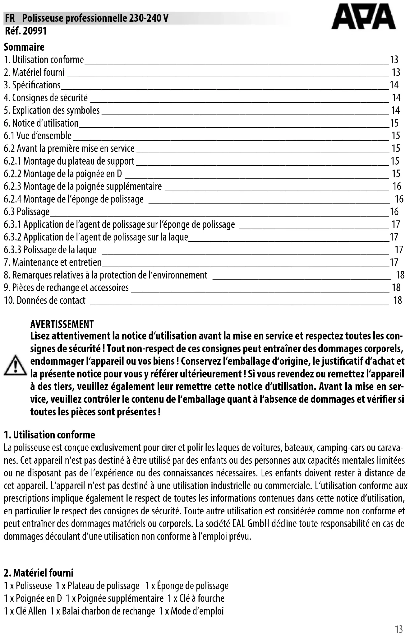 La polisseuse est conçue exclusivement pour cirer et polir les laques de voitures, bateaux, camping-cars ou carava- nes. Cet appareil n‘est pas destiné à être utilisé par des enfants ou des personnes aux capacités mentales limitées ou ne disposant pas de l‘expérience ou des connaissances nécessaires. Les enfants doivent rester à distance de cet appareil. L‘appareil n‘est pas destiné à une utilisation industrielle ou commerciale. L‘utilisation conforme aux prescriptions implique également le respect de toutes les informations contenues dans cette notice d‘utilisation, en particulier le respect des consignes de sécurité. Toute autre utilisation est considérée comme non conforme et peut entraîner des dommages matériels ou corporels. La société EAL GmbH décline toute responsabilité en cas de dommages découlant d’une utilisation non conforme à l’emploi prévu. AVERTISSEMENT Lisez attentivement la notice d‘utilisation avant la mise en service et respectez toutes les con- signes de sécurité ! Tout non-respect de ces consignes peut entraîner des dommages corporels, endommager l‘appareil ou vos biens ! Conservez l‘emballage d‘origine, le justicatif d‘achat et la présente notice pour vous y référer ultérieurement ! Si vous revendez ou remettez l‘appareil à des tiers, veuillez également leur remettre cette notice d‘utilisation. Avant la mise en ser- vice, veuillez contrôler le contenu de l‘emballage quant à l‘absence de dommages et vérier si toutes les pièces sont présentes !