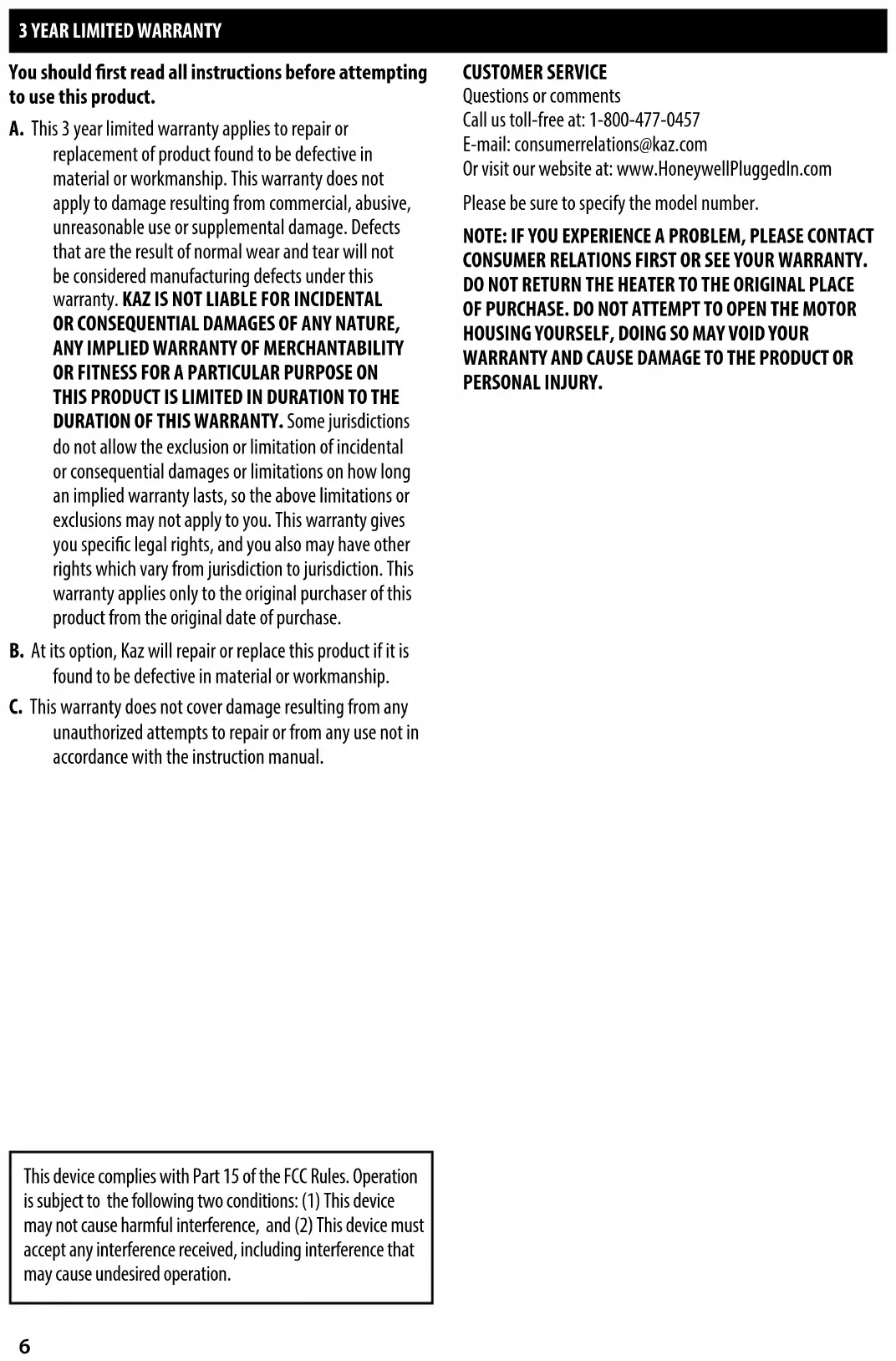 Questions ou commentaires Téléphonez-nous sans frais au : 1 800 477-0457 Courriel : consumerrelations@kaz.com Ou visitez notre site Web au : www.HoneywellPluggedIn.com N’oubliez pas d’indiquer le numéro de modèle. REMARQUE : SI VOUS AVEZ UN PROBLÈME, VEUILLEZ COMMUNIQUER AVEC NOTRE SERVICE À LA CLIENTÈLE OU RELIRE LA GARANTIE. NE RETOURNEZ PAS LE PRODUIT AU MAGASIN OÙ VOUS L’AVEZ ACHETÉ INITIALEMENT. N’ESSAYEZ PAS D’OUVRIR LE BOÎTIER DU MOTEUR, CAR CE FAISANT VOUS RISQUEZ D’ANNULER LA GARANTIE, D’ENDOMMAGER L’APPAREIL OU DE VOUS BLESSER. Appareil conforme à la partie 15 du règlement de la FCC. Utili sation sous réserve des deux conditions suivantes: (1) l’appareil ne doit pas produire de brouillage préjudiciable et (2) l’appareil doit accepter tout brouillage radioélectrique reçu, même si celui-ci est susceptible de compromettre son fonctionnement.13 IMPORTANTES INSTRUCCIONES DE SEGURIDAD