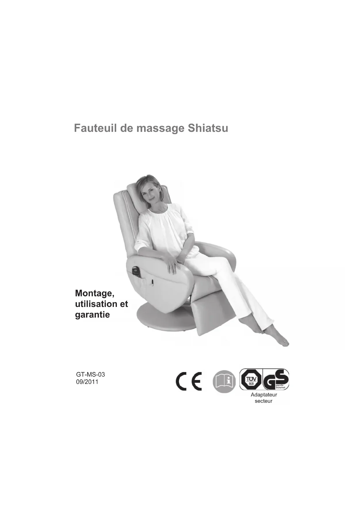 - Déclaration de conformité La conformité de ce produit avec les normes légales est garantie. Vous trouverez la déclaration de conformité complète sur Internet sous www.gt-support.de. Mise au rebut Eliminez l’emballage dans les conteneurs de collecte prévus à cet effet. Consultez l’organisation d’élimination de déchets à propos des mesures appropriées pour éliminer l’appareil quand vous ne voulez plus vous en servir. L’appareil ne doit pas être jeté avec les déchets ménagers.Poltrona massaggio Shiatsu Montaggio, istruzioni e garanzia GT-MS-03 09/2011 Adattatore di rete! 2 ! Indice Sicurezza p. 3