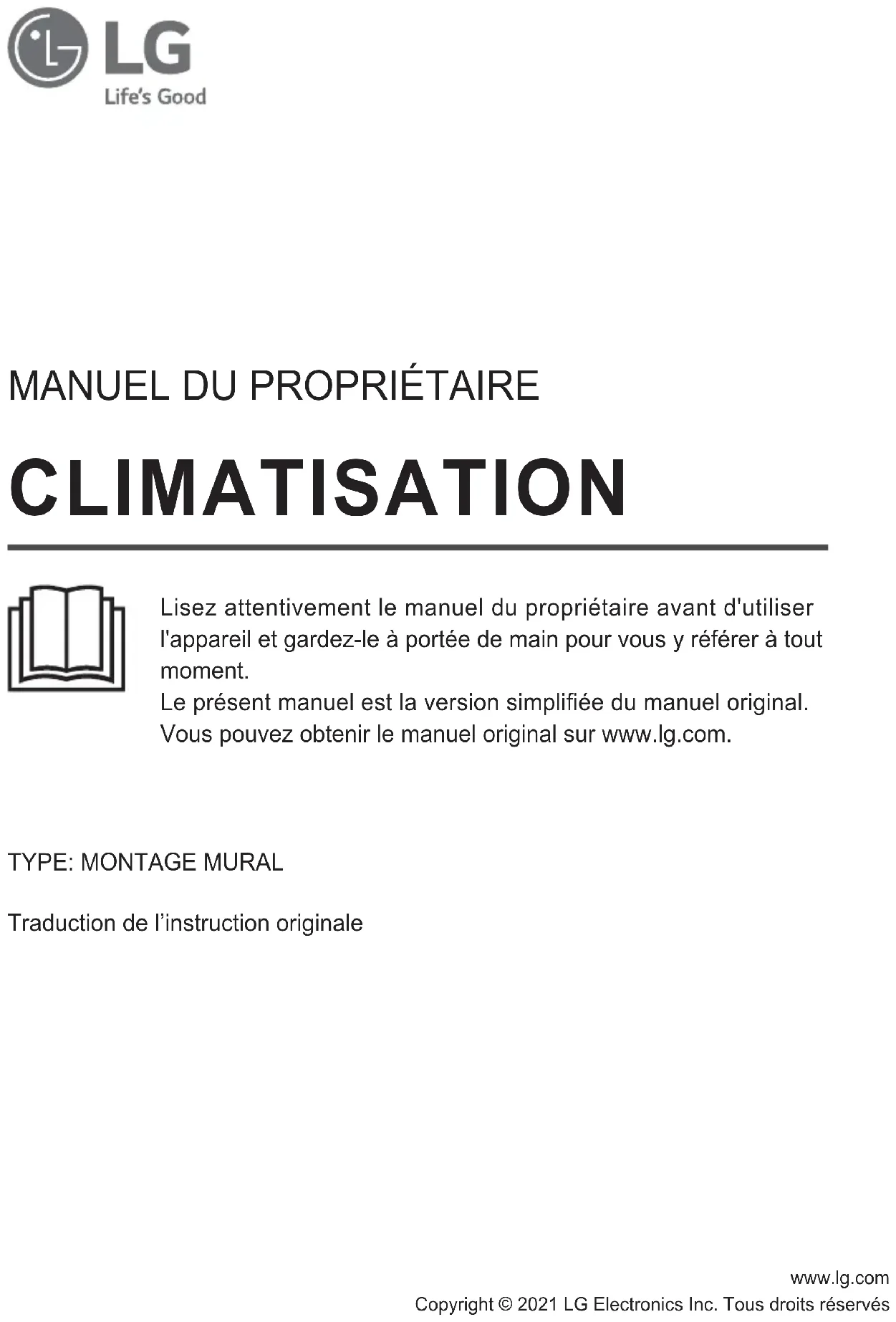 - Traduction de l’instruction originale Lisez attentivement le manuel du propriétaire avant d'utiliser l'appareil et gardez-le à portée de main pour vous y référer à tout moment. Le présent manuel est la version simplifiée du manuel original. Vous pouvez obtenir le manuel original sur www.lg.com.TABLE DES MATIÈRES Ce manuel peut contenir des images ou un contenu différent du modèle que vous avez acheté. Ce manuel est sujet à révision par le fabricant. UTILISATION p. 3