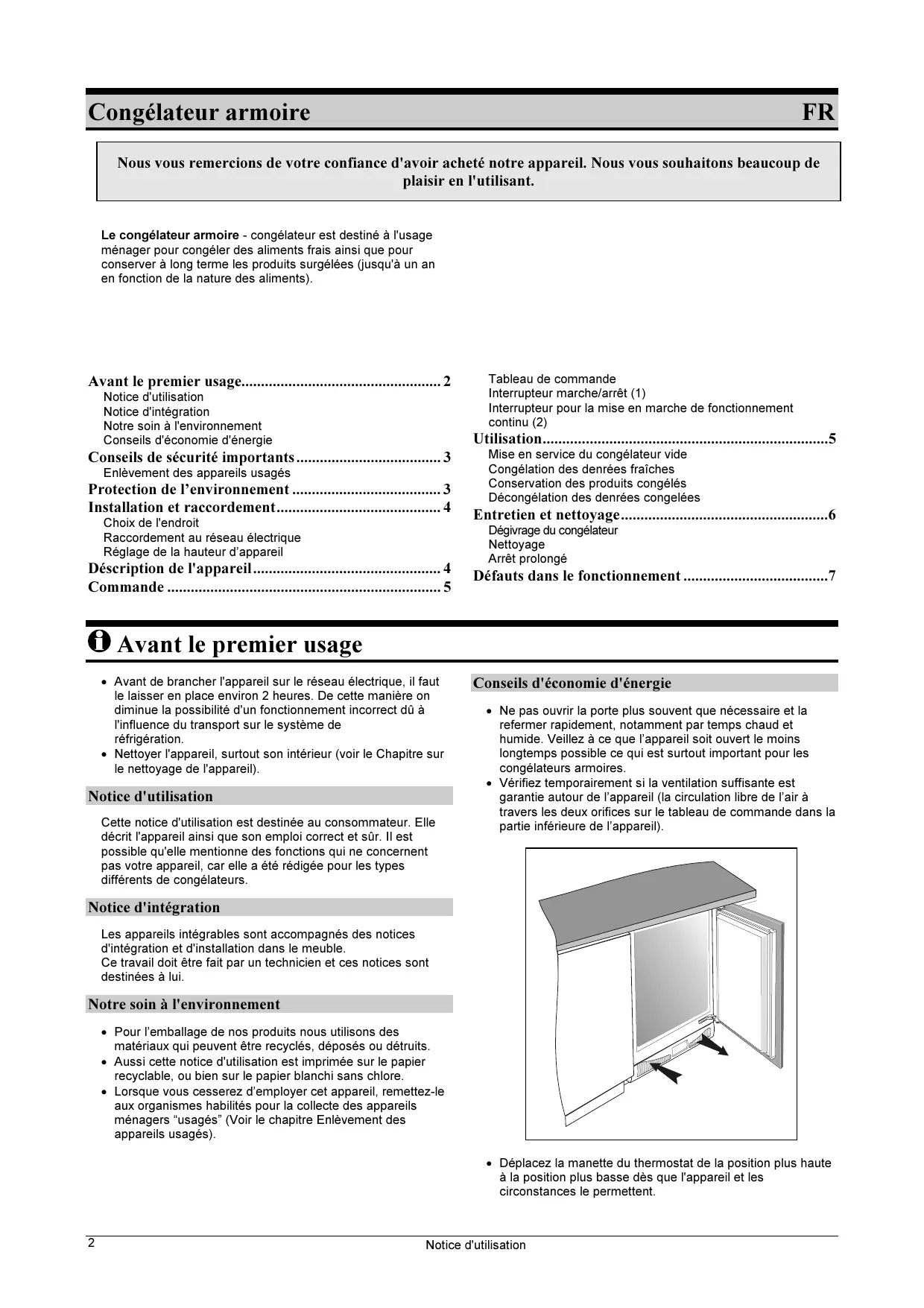 - Notice d'utilisation Notice d'intégration Notre soin à l'environnement Conseils d'économie d'énergie Tableau de commande Interrupteur marche/arrêt (1) Interrupteur pour la mise en marche de fonctionnement continu (2) Utilisation p. 5