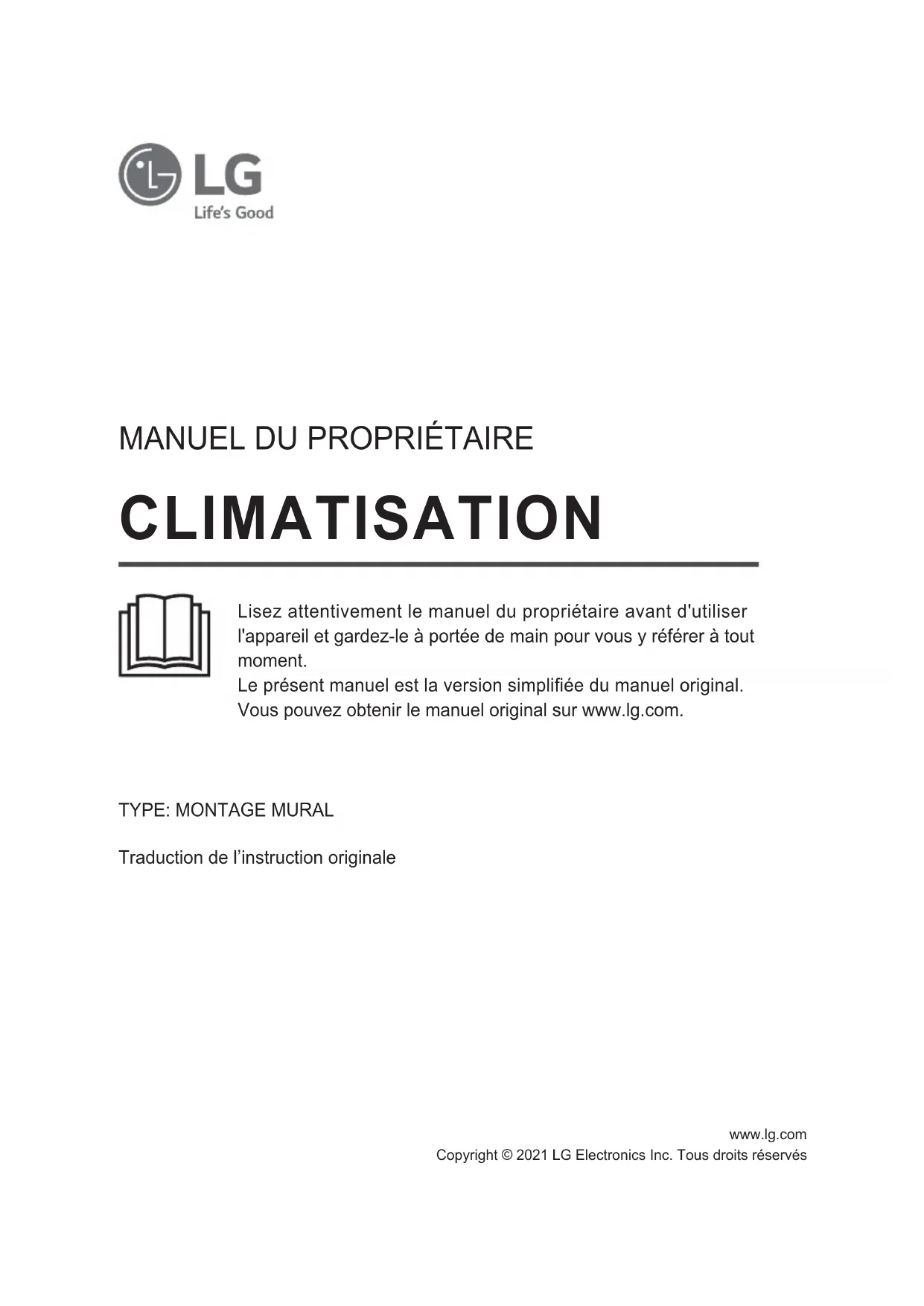 - Traduction de l’instruction originale Lisez attentivement le manuel du propriétaire avant d'utiliser l'appareil et gardez-le à portée de main pour vous y référer à tout moment. Le présent manuel est la version simplifiée du manuel original. Vous pouvez obtenir le manuel original sur www.lg.com.TABLE DES MATIÈRES Ce manuel peut contenir des images ou un contenu différent du modèle que vous avez acheté. Ce manuel est sujet à révision par le fabricant. UTILISATION p. 3