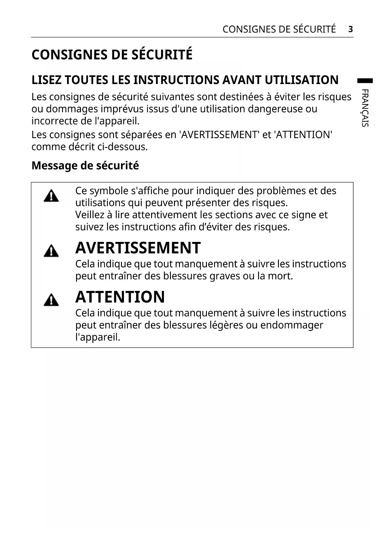 Les consignes de sécurité suivantes sont destinées à éviter les risques ou dommages imprévus issus d'une utilisation dangereuse ou incorrecte de l'appareil. Les consignes sont séparées en 'AVERTISSEMENT' et 'ATTENTION' comme décrit ci-dessous. Message de sécurité Ce symbole s'affiche pour indiquer des problèmes et des utilisations qui peuvent présenter des risques. Veillez à lire attentivement les sections avec ce signe et suivez les instructions afin d’éviter des risques. AVERTISSEMENT Cela indique que tout manquement à suivre les instructions peut entraîner des blessures graves ou la mort. ATTENTION Cela indique que tout manquement à suivre les instructions peut entraîner des blessures légères ou endommager l'appareil.4