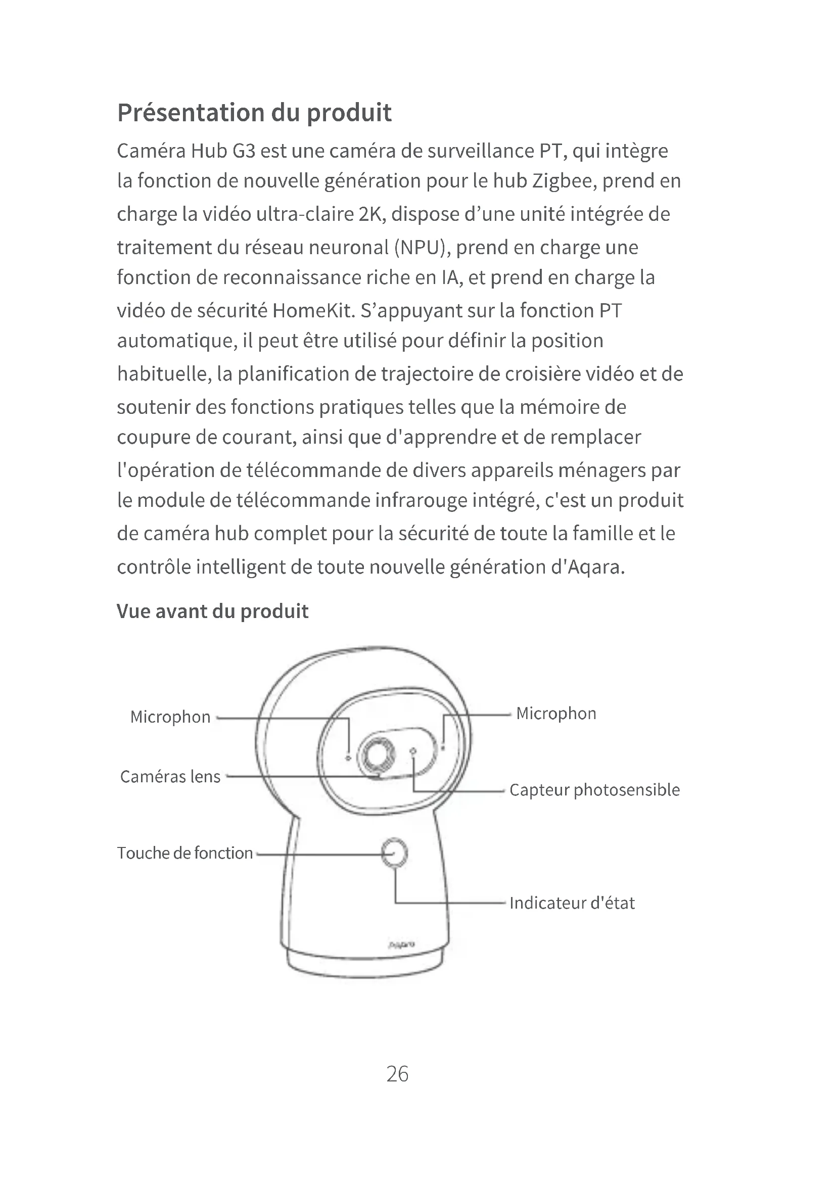 - Оборудование не нуждается в периодическом обслуживании в течение срока службы.25 Изготовитель: Lumi United Technology Co., Ltd. Адрес: 8th Floor, JinQi Wisdom Valley, No.1 Tangling Road, Liuxian Ave, Taoyuan Residential District, Nanshan District, Shenzhen,China Онлайн-служба поддержки: www.aqara.com/support Электронная почта: support@aqara.com Сделано в КитаеPrésentation du produit Caméra Hub G3 est une caméra de surveillance PT, qui intègre la fonction de nouvelle génération pour le hub Zigbee, prend en charge la vidéo ultra-claire 2K, dispose d’une unité intégrée de traitement du réseau neuronal (NPU), prend en charge une fonction de reconnaissance riche en IA, et prend en charge la vidéo de sécurité HomeKit. S’appuyant sur la fonction PT automatique, il peut être utilisé pour définir la position habituelle, la planification de trajectoire de croisière vidéo et de soutenir des fonctions pratiques telles que la mémoire de coupure de courant, ainsi que d'apprendre et de remplacer l'opération de télécommande de divers appareils ménagers par le module de télécommande infrarouge intégré, c'est un produit de caméra hub complet pour la sécurité de toute la famille et le contrôle intelligent de toute nouvelle génération d'Aqara. Vue avant du produit Touche de fonction Caméras lens Microphon Microphon Capteur photosensible Indicateur d'état 26Description de la Touche de Fonction