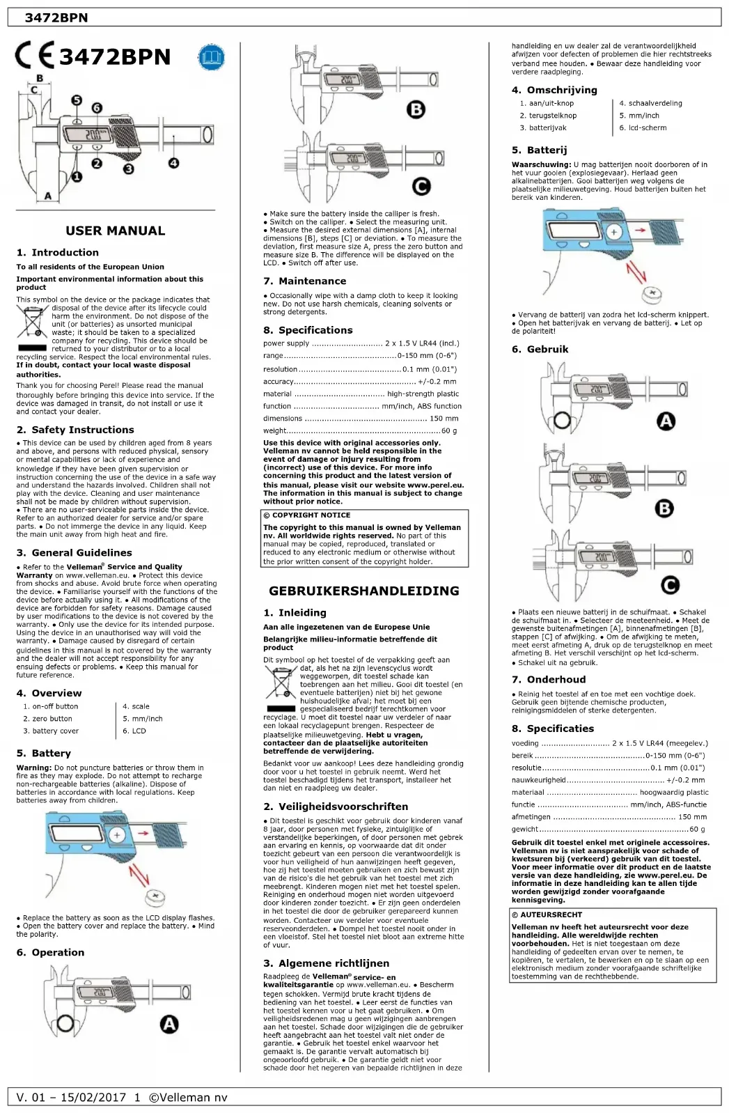 alimentation .................... 2 x pile LR44 de 1.5 V (incl.) plage .............................................. 0-150 mm (0-6") résolution .......................................... 0.1 mm (0.01") précision ................................................. +/-0.2 mm matériau ................................ plastic haute résistance fonction ............................... mm/pouces, fonction ABS dimensions .................................................. 150 mm poids................................................................. 60 g N'employer cet appareil qu’avec des accessoires d’origine. Velleman SA ne peut, dans la mesure conforme au droit applicable être tenue responsable des dommages ou lésions (directs ou indirects) pouvant résulter de l’utilisation de cet appareil. Pour plus d’informations concernant cet article et la dernière version de ce mode d'emploi, visiter notre site web www.perel.eu. Les spécifications et le continu de ce mode d'emploi peuvent être modifiés sans notification préalable.