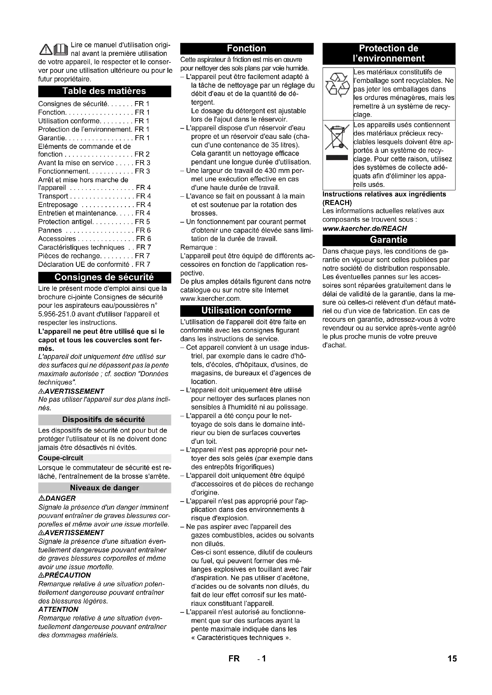 Chairman of the Board of Management Director Regulatory Affairs & Certification 14 EN- 1 Lire ce manuel d'utilisation origi- nal avant la première utilisation de votre appareil, le respecter et le conser- ver pour une utilisation ultérieure ou pour le futur propriétaire. Lire le présent mode d'emploi ainsi que la brochure ci-jointe Consignes de sécurité pour les aspirateurs eau/poussières n° 5.956-251.0 avant d'utiliser l'appareil et respecter les instructions. L'appareil ne peut être utilisé que si le capot et tous les couvercles sont fer- més. L'appareil doit uniquement être utilisé sur des surfaces qui ne dépassent pas la pente maximale autorisée ; cf. section "Données techniques". 몇 AVERTISSEMENT Ne pas utiliser l'appareil sur des plans incli- nés. Les dispositifs de sécurité ont pour but de protéger l'utilisateur et ils ne doivent donc jamais être désactivés ni évités. Lorsque le commutateur de sécurité est re- lâché, l'entraînement de la brosse s'arrête. DANGER Signale la présence d'un danger imminent pouvant entraîner de graves blessures cor- porelles et même avoir une issue mortelle. 몇 AVERTISSEMENT Signale la présence d'une situation éven- tuellement dangereuse pouvant entraîner de graves blessures corporelles et même avoir une issue mortelle. 몇 PRÉCAUTION Remarque relative à une situation poten- tiellement dangereuse pouvant entraîner des blessures légères. ATTENTION Remarque relative à une situation éven- tuellement dangereuse pouvant entraîner des dommages matériels. Cette aspirateur à friction est mis en œuvre pour nettoyer des sols plans par voie humide. – L'appareil peut être facilement adapté à la tâche de nettoyage par un réglage du débit d'eau et de la quantité de dé- tergent. Le dosage du détergent est ajustable lors de l'ajout dans le réservoir. – L'appareil dispose d'un réservoir d'eau propre et un réservoir d'eau sale (cha- cun d'une contenance de 35 litres). Cela garantit un nettoyage efficace pendant une longue durée d'utilisation. – Une largeur de travail de 430 mm per- met une exécution effective en cas d'une haute durée de travail. – L'avance se fait en poussant à la main et est soutenue par la rotation des brosses. – Un fonctionnement par courant permet d'obtenir une capacité élevée sans limi- tation de la durée de travail. Remarque : L'appareil peut être équipé de différents ac- cessoires en fonction de l'application res- pective. De plus amples détails figurent dans notre catalogue ou sur notre site Internet www.kaercher.com. L'utilisation de l'appareil doit être faite en conformité avec les consignes figurant dans les instructions de service. – Cet appareil convient à un usage indus- triel, par exemple dans le cadre d'hô- tels, d'écoles, d'hôpitaux, d'usines, de magasins, de bureaux et d'agences de location. – L'appareil doit uniquement être utilisé pour nettoyer des surfaces planes non sensibles à l'humidité ni au polissage. – L'appareil a été conçu pour le net- toyage de sols dans le domaine inté- rieur ou bien de surfaces couvertes d'un toit. – L'appareil n'est pas approprié pour net- toyer des sols gelés (par exemple dans des entrepôts frigorifiques) – L'appareil doit uniquement être équipé d'accessoires et de pièces de rechange d'origine. – L'appareil n'est pas approprié pour l'ap- plication dans des environnements à risque d'explosion. – Ne pas aspirer avec l'appareil des gazes combustibles, acides ou solvants non dilués. Ces-ci sont essence, dilutif de couleurs ou fuel, qui peuvent former des mé- langes explosives en touillant avec l'air d'aspiration. Ne pas utiliser d’acétone, d’acides ou de solvants non dilués, du fait de leur effet corrosif sur les maté- riaux constituant l’appareil. – L'appareil n'est autorisé au fonctionne- ment que sur des surfaces ayant la pente maximale indiquée dans les « Caractéristiques techniques ». Instructions relatives aux ingrédients (REACH) Les informations actuelles relatives aux composants se trouvent sous : www.kaercher.de/REACH Dans chaque pays, les conditions de ga- rantie en vigueur sont celles publiées par notre société de distribution responsable. Les éventuelles pannes sur les acces- soires sont réparées gratuitement dans le délai de validité de la garantie, dans la me- sure où celles-ci relèvent d'un défaut maté- riel ou d'un vice de fabrication. En cas de recours en garantie, adressez-vous à votre revendeur ou au service après-vente agréé le plus proche munis de votre preuve d'achat. Table des matières Consignes de sécurité... FR 1 Fonction... FR 1 Utilisation conforme... FR 1 Protection de l’environnement. FR 1 Garantie... FR 1 Eléments de commande et de fonction ... FR 2 Avant la mise en service ... FR 3 Fonctionnement... FR 3 Arrêt et mise hors marche de l'appareil ... FR 4 Transport ... FR 4 Entreposage ... FR 4 Entretien et maintenance... FR 4 Protection antigel... FR 5 Pannes ... FR 6 Accessoires ... FR 6 Caractéristiques techniques ... FR 7 Pièces de rechange... FR 7 Déclaration UE de conformité . FR 7 Consignes de sécurité Dispositifs de sécurité Coupe-circuit Niveaux de danger Fonction Utilisation conforme Protection de l’environnement Les matériaux constitutifs de l’emballage sont recyclables. Ne pas jeter les emballages dans les ordures ménagères, mais les remettre à un système de recy- clage. Les appareils usés contiennent des matériaux précieux recy- clables lesquels doivent être ap- portés à un système de recy- clage. Pour cette raison, utilisez des systèmes de collecte adé- quats afin d'éliminer les appa- reils usés. Garantie 15FR- 2 1 Crible à peluches 2 Coupe-circuit 3 Flexible de vidange de l'eau sale avec dispositif de dosage 4 Rail de maintien pour la base fixe 5 Flotteur 6 Réservoir d'eau propre 7 Fermeture du réservoir d'eau propre 8 Trou de poignée 9 Tête de nettoyage 10 Disque-brosse 