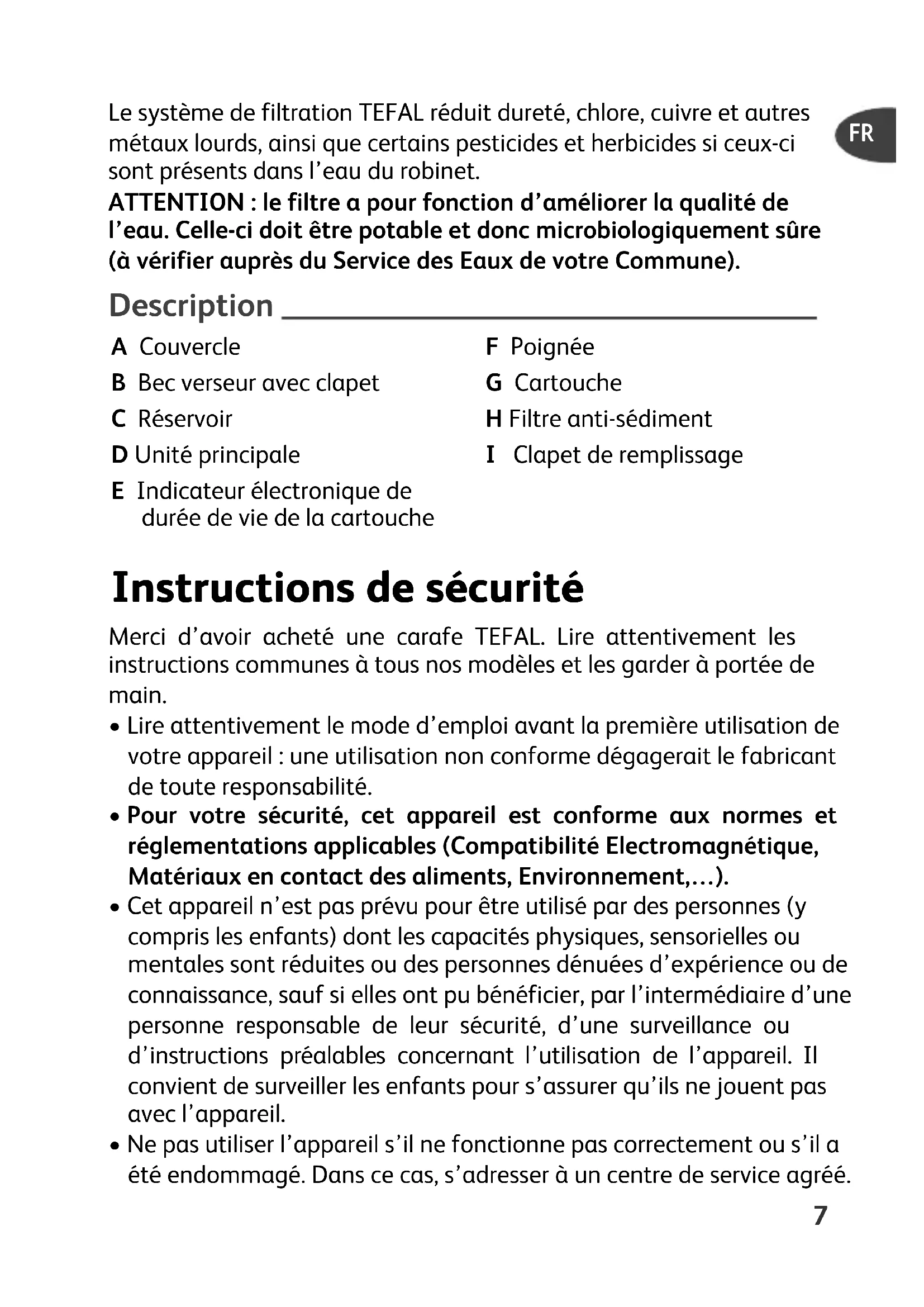 Le système de filtration TEFAL réduit dureté, chlore, cuivre et autres métaux lourds, ainsi que certains pesticides et herbicides si ceux-ci sont présents dans l’eau du robinet. ATTENTION : le filtre a pour fonction d’améliorer la qualité de l’eau. Celle-ci doit être potable et donc microbiologiquement sûre (à vérifier auprès du Service des Eaux de votre Commune). Description Instructions de sécurité Merci d’avoir acheté une carafe TEFAL. Lire attentivement les instructions communes à tous nos modèles et les garder à portée de main.