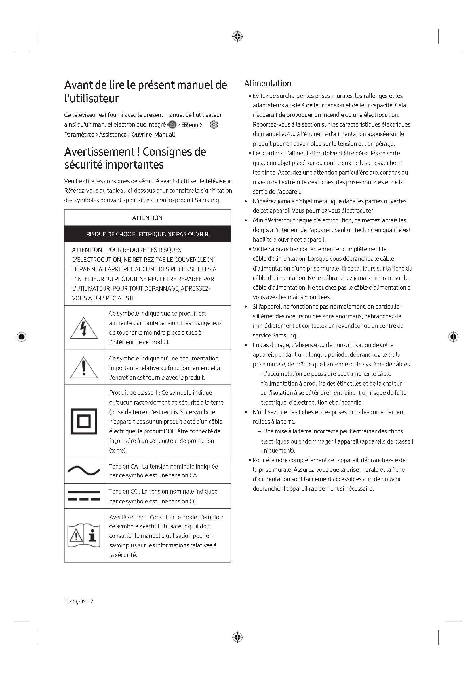 - For your safety, you must not attempt to remove the battery. If the battery is not properly removed, it may lead to damage to the battery and device, cause personal injury, and/or result in the device being unsafe. English - 8This page is intentionally left blank.Avant de lire le présent manuel de l'utilisateur Ce téléviseur est fourni avec le présent manuel de l'utilisateur ainsi qu'un manuel électronique intégré ( > Menu > Paramètres > Assistance > Ouvrir e-Manual). Avertissement! Consignes de sécurité importantes Veuillez lire les consignes de sécurité avant d'utiliser le téléviseur. Référez-vous au tableau ci-dessous pour connaitre la signification des symboles pouvant apparaitre sur votre produit Samsung. ATTENTION RISQUE DE CHOC ÉLECTRIQUE. NE PAS OUVRIR.