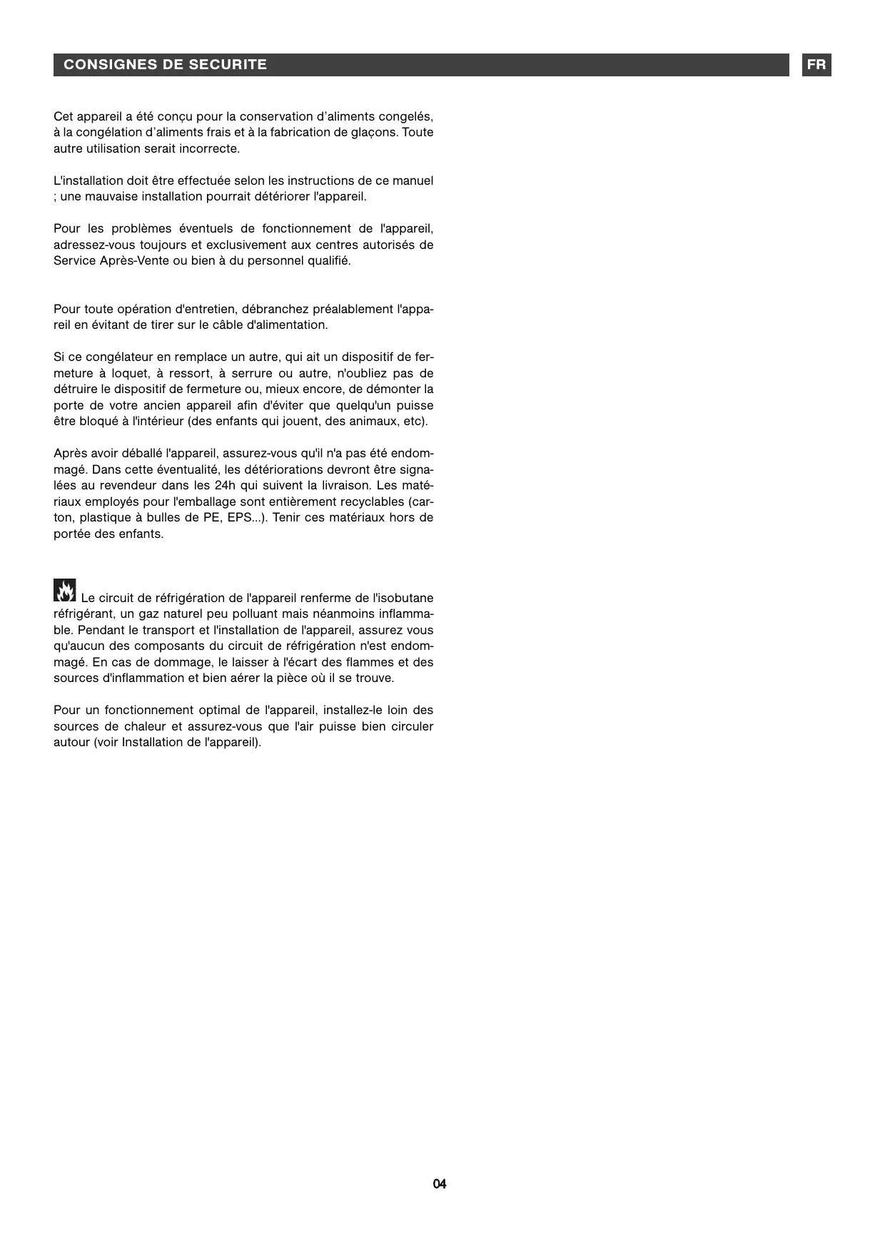 Cet appareil a été conçu pour la conservation d’aliments congelés, à la congélation d’aliments frais et à la fabrication de glaçons. Toute autre utilisation serait incorrecte. L'installation doit être effectuée selon les instructions de ce manuel ; une mauvaise installation pourrait détériorer l'appareil. Pour les problèmes éventuels de fonctionnement de l'appareil, adressez-vous toujours et exclusivement aux centres autorisés de Service Après-Vente ou bien à du personnel qualifié. Pour toute opération d'entretien, débranchez préalablement l'appareil en évitant de tirer sur le câble d'alimentation. Si ce congélateur en remplace un autre, qui ait un dispositif de fermeture à loquet, à ressort, à serrure ou autre, n'oubliez pas de détruire le dispositif de fermeture ou, mieux encore, de démonter la porte de votre ancien appareil afin d'éviter que quelqu'un puisse être bloqué à l'intérieur (des enfants qui jouent, des animaux, etc). Après avoir déballé l'appareil, assurez-vous qu'il n'a pas été endommagé. Dans cette éventualité, les détériorations devront être signalées au revendeur dans les 24h qui suivent la livraison. Les matériaux employés pour l'emballage sont entièrement recyclables (carton, plastique à bulles de PE, EPS…). Tenir ces matériaux hors de portée des enfants. Le circuit de réfrigération de l'appareil renferme de l'isobutane réfrigérant, un gaz naturel peu polluant mais néanmoins inflammable. Pendant le transport et l'installation de l'appareil, assurez vous qu'aucun des composants du circuit de réfrigération n'est endommagé. En cas de dommage, le laisser à l'écart des flammes et des sources d'inflammation et bien aérer la pièce où il se trouve. Pour un fonctionnement optimal de l'appareil, installez-le loin des sources de chaleur et assurez-vous que l'air puisse bien circuler autour (voir Installation de l'appareil).
