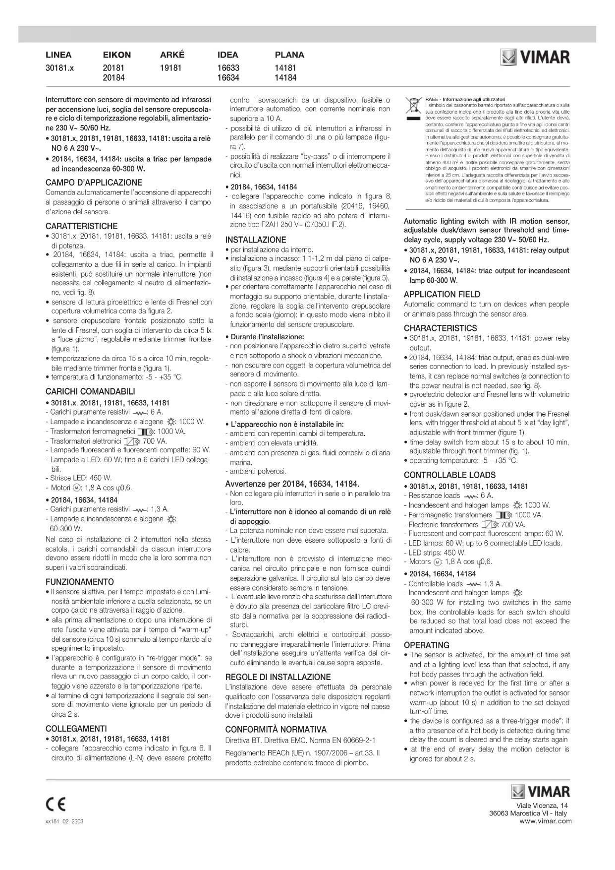 . La collecte séparée appropriée pour l’envoi successif de l’appareil en fin de vie au recyclage, au traitement et à l’élimination dans le respect de l’environnement contribue à éviter les effets négatifs sur l’environ- nement et sur la santé et favorise le réemploi et/ou le recyclage des matériaux dont l’appareil est composé. Interruptor con sensor de movimiento por infrarrojos para el encendido de luces, umbral del sensor crepus- colar y ciclo de temporización regulables, alimenta- ción 230 V~ 50/60 Hz.