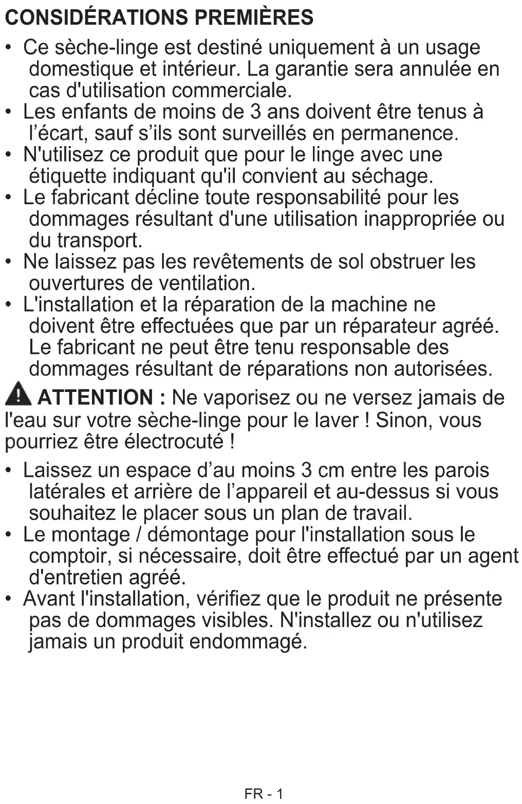 - Ce sèche-linge est destiné uniquement à un usage domestique et intérieur. La garantie sera annulée en cas d'utilisation commerciale.
