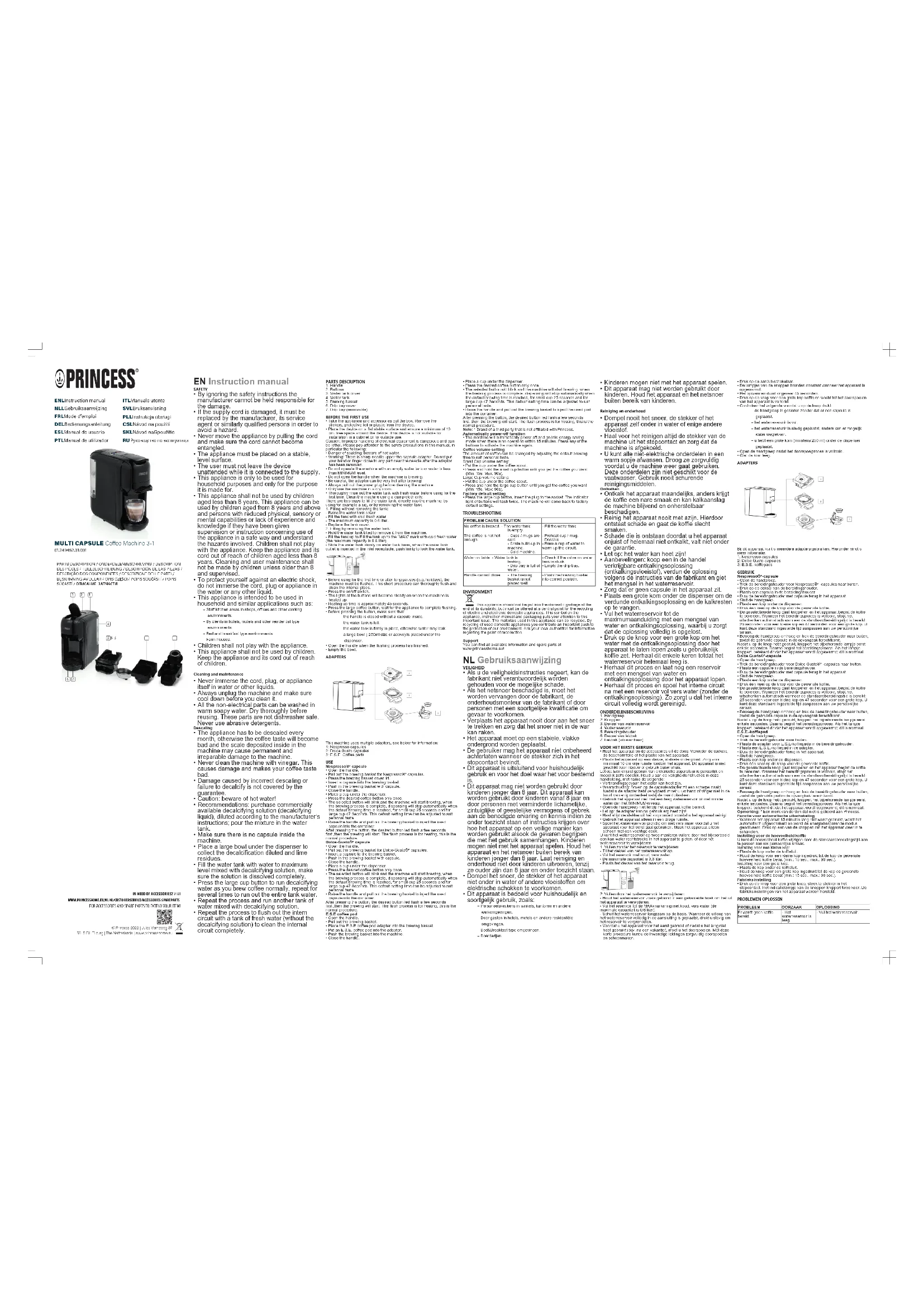 Retrouvez gratuitement la notice de l'appareil Multi Capsule Coffee Machine 31 249452 PRINCESS au format PDF.