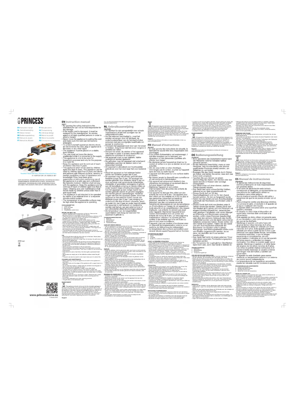 - La plaque de la pierre à cuire ne va pas au lave-vaisselle. ENVIRONNEMENT Cet appareil ne doit pas être jeté avec les déchets ménagers à la fin de sa durée de vie, il doit être remis à un centre de recyclage pour les appareils électriques et électroniques. Ce symbole sur l'appareil, le manuel d'utilisation et l'emballage attire votre attention sur un point important. Les matériaux utilisés dans cet appareil sont recyclables. En recyclant vos appareils, vous contribuez de manière significative à la protection de notre environnement. Renseignez-vous auprès des autorités locales pour connaître les centres de collecte des déchets. Support Vous retrouvez toutes les informations et pièces de rechange sur www.princesshome.eu! DEBedienungsanleitung SICHERHEIT