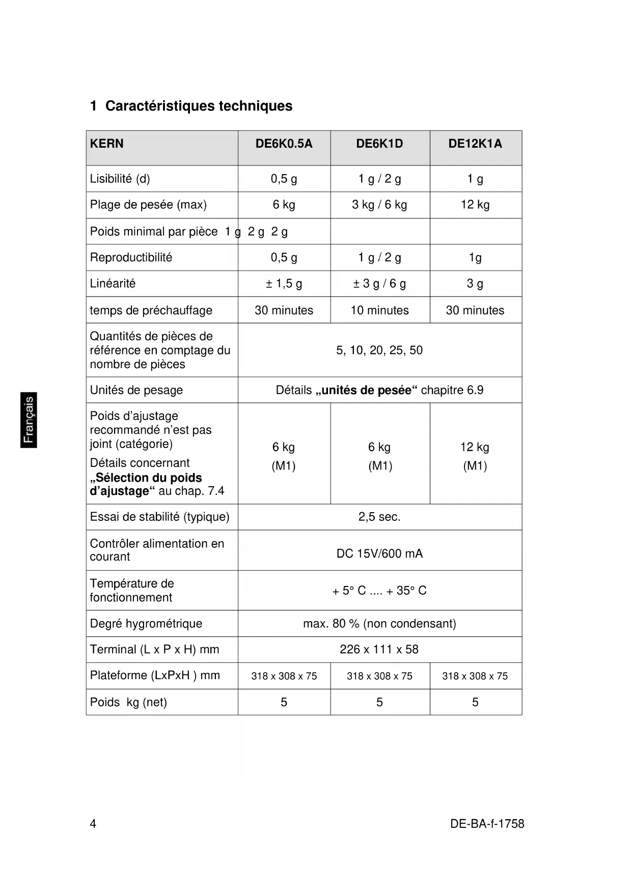 KERN DE15K0.2D DE15K2D DE24K2A Lisibilité (d) 0,2 g / 0,5 g 2 g / 5 g 2 g Plage de pesée (max) 6 kg / 15 kg 6 kg / 15 kg 24 kg Poids minimal par pièce 400 mg 4 g 4 g Reproductibilité 0,2 g / 0,5 g 2 g / 5g 2 g Linéarité ± 0,8 g / 2 g ± 6 g / 15 g ± 6 g temps de préchauffage 2 heures 10 minutes 30 minutes Quantités de pièces de référence en comptage du nombre de pièces 5, 10, 20, 25, 50 Unités de pesage Détails „unités de pesée“ chapitre 6.9 Poids d’ajustage recommandé n’est pas joint (catégorie) Détails concernant „Sélection du poids d’ajustage“ au chap. 7.4 15 kg (F2) 15 kg (M1) 20 kg (M1) Essai de stabilité (typique) 2,5 sec. Contrôler alimentation en courant DC 15V/600 mA Température de fonctionnement + 5° C .... + 35° C Degré hygrométrique max. 80 % (non condensant) Terminal (L x P x H) mm 226 x 111 x 58 Plateforme (L x P x H) mm 318 x 308 x 85 318 x 308 x 75 Poids kg (net) 7,5 5DE-BA-f-1758