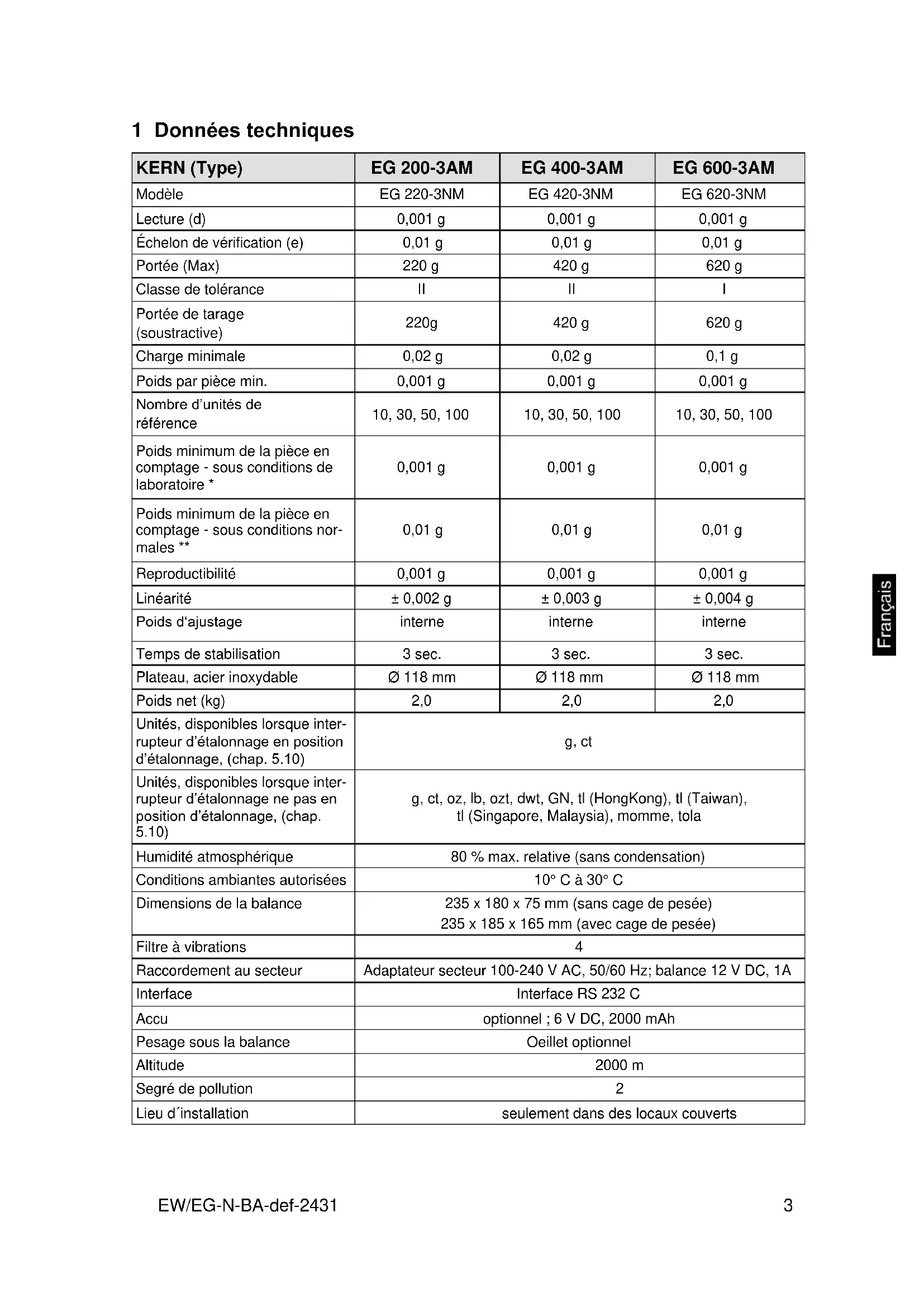 1 Données techniques KERN (Type) EG 200-3AM EG 400-3AM EG 600-3AM Modèle EG 220-3NM EG 420-3NM EG 620-3NM Lecture (d) 0,001 g 0,001 g 0,001 g Échelon de vérification (e) 0,01 g 0,01 g 0,01 g Portée (Max) 220 g 420 g 620 g Classe de tolérance