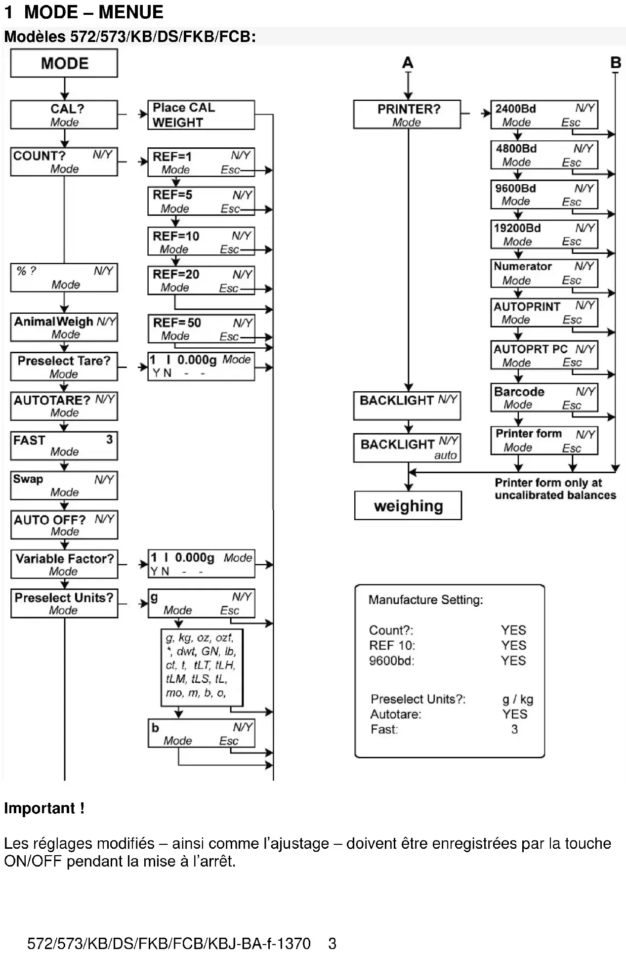 Important ! Les réglages modifiés – ainsi comme l’ajustage – doivent être enregistrées par la touche ON/OFF pendant la mise à l’arrêt.572/573/KB/DS/FKB/FCB/KBJ-BA-f-1370