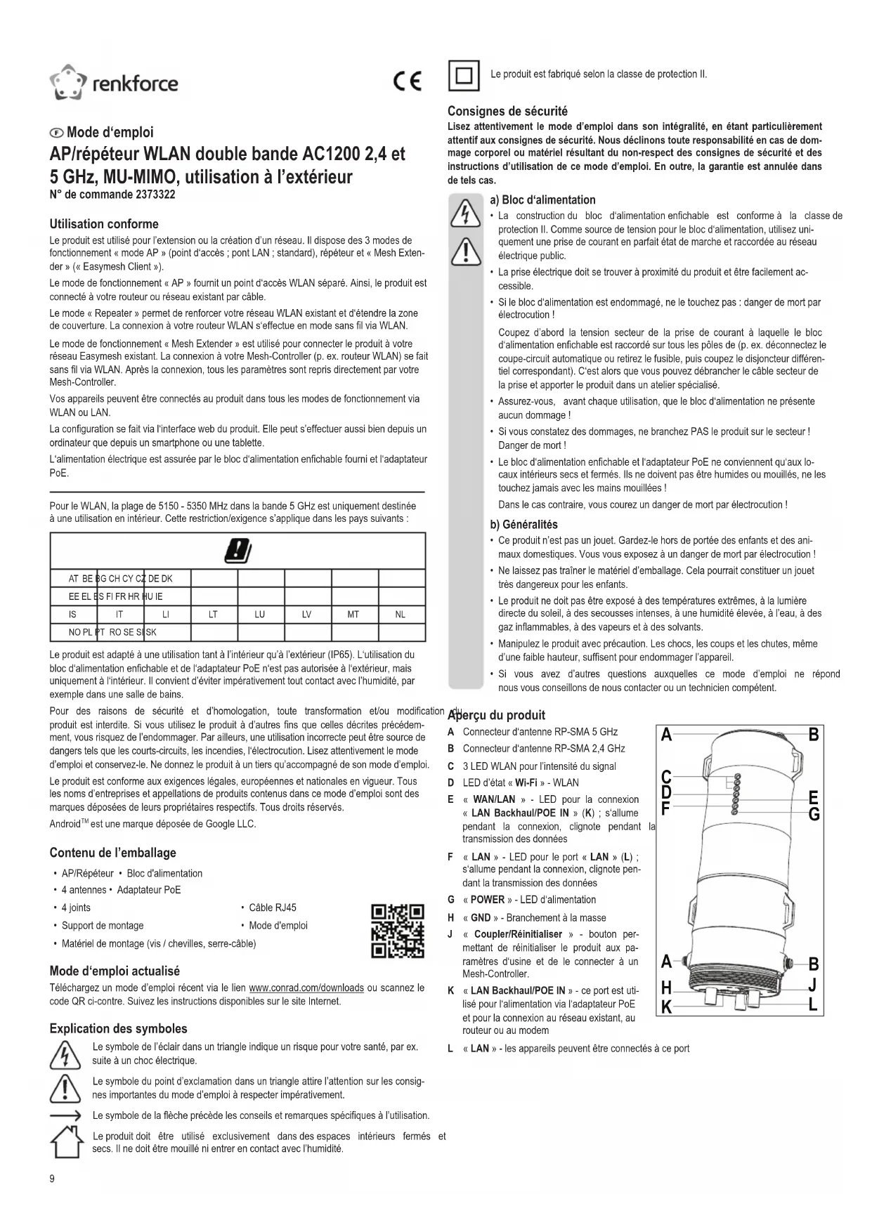 - atthecollectionpointsofpublicwastemanagementauthoritiesorthecollectionpointssetup by manufacturers or distributors within the meaning of the ElektroG EndusersareresponsiblefordeletingpersonaldatafromtheWEEEtobedisposedof. ItshouldbenotedthatdifferentobligationsaboutthereturnorrecyclingofWEEEmayapplyin countries outside of Germany. Specications a) Product Operatingvoltage ......................... 24 V/DC (Passive PoE) Currentconsumption .................... max. 0.5 A Connections .................................. 2x RJ45 10/100/1000 Mbit/s, 1x WAN/PoE, 1x LAN WLAN ........................................... IEEE802.11b/g/n/ac; 2,4 GHz (max. 300 MBit); 5GHz,(max.867MBit)Dual-BandMU-MIMO Frequency range/ transmissionpower ....................... 2412-2472MHz,≤20dBm 5150-5350MHz,≤21dBm(onlyintendedforindooruse) 5470-5725MHz,≤21dBm Encryptionprotocols ..................... WPA2-PSK Operatingmodes .......................... APmode(accesspoint;LANbridge;standard), Repeater,MeshExtender(“EasymeshClient”) Chipset ........................................ MT7621DA,MT7613B,MT7603E Memory ......................................... Flash 128 MB, DDR2 1024 MB Protection rating ........................... IP65 Dimensions of the device (W x H x D) ................................... approx.72.6x227x62mm(withoutantennaandbracket) Dimensions of the antenna (Ø x L) ........................................... approx.13x250mm/13x280mm Weight .......................................... approx.348g(withantenna,withoutbracket) Operatingconditions ..................... -30to+70°C,10to90%RH(non-condensing) Storage conditions ........................ -40to+70°C,10to90%RH(non-condensing) b) Power adapter Operatingvoltage ......................... 100 – 240 V/AC, 50/60 Hz Currentconsumption .................... max. 0.5 A Output ........................................... 24 V/DC, 500 mA, 12 W Outputconnector .......................... 5.5x2.5mmcoaxialpowerconnector89 Mode d‘emploi AP/répéteur WLAN double bande AC1200 2,4 et 5 GHz, MU-MIMO, utilisation à l’extérieur N° de commande 2373322 Utilisation conforme Leproduitestutilisépourl’extensionoulacréationd’unréseau.Ildisposedes3modesdefonctionnement«modeAP»(pointd‘accès;pontLAN;standard),répéteuret«MeshExten-der » (« Easymesh Client »).Lemodedefonctionnement«AP»fournitunpointd‘accèsWLANséparé.Ainsi,leproduitestconnectéàvotrerouteurouréseauexistantparcâble.Lemode«Repeater»permetderenforcervotreréseauWLANexistantetd‘étendrelazonedecouverture.LaconnexionàvotrerouteurWLANs‘effectueenmodesanslviaWLAN.Lemodedefonctionnement«MeshExtender»estutilisépourconnecterleproduitàvotreréseauEasymeshexistant.LaconnexionàvotreMesh-Controller(p.ex.routeurWLAN)sefaitsanslviaWLAN.Aprèslaconnexion,touslesparamètressontreprisdirectementparvotreMesh-Controller.VosappareilspeuventêtreconnectésauproduitdanstouslesmodesdefonctionnementviaWLAN ou LAN.Lacongurationsefaitvial‘interfacewebduproduit.Ellepeuts’effectueraussibiendepuisunordinateurquedepuisunsmartphoneouunetablette.L‘alimentationélectriqueestassuréeparleblocd‘alimentationenchablefournietl‘adaptateur PoE. PourleWLAN,laplagede5150-5350MHzdanslabande5GHzestuniquementdestinéeàuneutilisationenintérieur.Cetterestriction/exigences’appliquedanslespayssuivants:AT BE BG CH CY CZ DE DKEE EL ES FI FR HR HU IE IS IT LI LT LU LV MT NL NO PL PT RO SE SI SKLeproduitestadaptéàuneutilisationtantàl’intérieurqu’àl’extérieur(IP65).L‘utilisationdublocd‘alimentationenchableetdel‘adaptateurPoEn‘estpasautoriséeàl‘extérieur,maisuniquementàl‘intérieur.Ilconvientd’éviterimpérativementtoutcontactavecl’humidité,parexempledansunesalledebains.Pour des raisons de sécurité et d’homologation, toute transformation et/ou modication du produitestinterdite.Sivousutilisezleproduitàd’autresnsquecellesdécritesprécédem- ment,vousrisquezdel’endommager.Parailleurs,uneutilisationincorrectepeutêtresourcededangerstelsquelescourts-circuits,lesincendies,l‘électrocution.Lisezattentivementlemoded’emploietconservez-le.Nedonnezleproduitàuntiersqu’accompagnédesonmoded’emploi.Leproduitestconformeauxexigenceslégales,européennesetnationalesenvigueur.Touslesnomsd’entreprisesetappellationsdeproduitscontenusdanscemoded’emploisontdesmarquesdéposéesdeleurspropriétairesrespectifs.Tousdroitsréservés.Android estunemarquedéposéedeGoogleLLC. Contenu de l’emballage