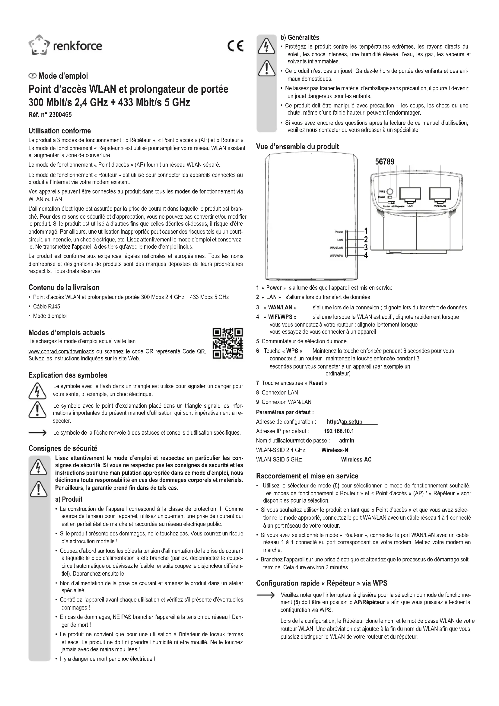 - Point d’accès WLAN et prolongateur de portée 300 Mbps 2,4 GHz + 433 Mbps 5 GHz• Câble RJ45• Mode d’emploi Modes d’emplois actuels Téléchargez le mode d’emploi actuel via le lienwww.conrad.com/downloads ou scannez le code QR représenté Code QR. Suivez les instructions indiquées sur le site Web. Explication des symboles Lesymboleavecleashdansuntriangleestutilisépoursignalerundangerpour votre santé, p. exemple, un choc électrique. Le symbole avec le point d’exclamation placé dans un triangle signale les infor- mations importantes du présent manuel d’utilisation qui sont impérativement à re-specter. Lesymboledelaècherenvoieàdesastucesetconseilsd’utilisationspéciques. Consignes de sécurité Lisez attentivement le mode d’emploi et respectez en particulier les con-signes de sécurité. Si vous ne respectez pas les consignes de sécurité et les instructions pour une manipulation appropriée dans ce mode d’emploi, nous déclinons toute responsabilité en cas des dommages corporels et matériels. Par ailleurs, la garantie prend n dans de tels cas. a) Produit
