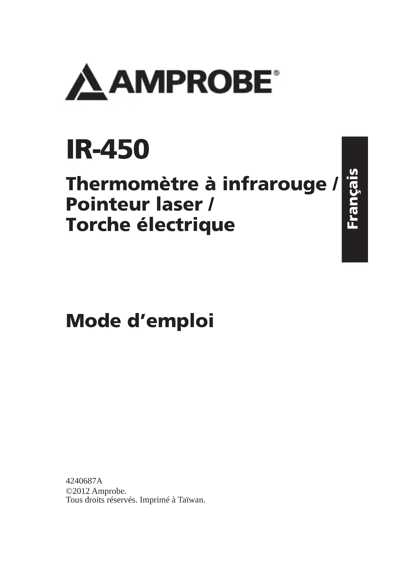 Lens Cleaning: Blow off loose particles using clean compressed air. Gently brush remaining debris away with a brush. Carefully wipe the surface with a moist cotton swab. The swab may be moistened with water or rubbing alcohol. NOTE: DO NOT use solvents to clean the plastic lens. Case Cleaning: Use soap and water on a damp sponge or soft cloth. NOTE: DO NOT submerge the unit in water.10 BATTERY REPLACEMENT Please replace the battery when “Battery indicator” is flashing on display. When battery is replaced / installed, the unit will go into standby mode automatically.IR-450 Thermomètre à infrarouge / Pointeur laser / Torche électrique Mode d’emploi 4240687A ©2012 Amprobe. Tous droits réservés. Imprimé à Taïwan. FrançaisLimites de garantie et de responsabilité Amprobe garantit l’absence de vices de matériaux et de fabrication de ce produit pendant une période d’un an prenant effet à la date d’achat, sauf disposition contraire prévue par la loi. Cette garantie ne s’applique pas aux fusibles, aux piles jetables ni à tout produit mal utilisé, modifié, contaminé, négligé ou endommagé par accident ou soumis à des conditions anormales d’utilisation et de manipulation. Les revendeurs n’ont pas l’autorisation de prolonger toute autre garantie au nom d’Amprobe. Pour bénéficier de la garantie, renvoyez le produit accompagné d’un justificatif d’achat auprès d’un centre de services agréé par Amprobe ou d’un distributeur ou d’un revendeur Amprobe. Voir la section Réparation pour tous les détails. LA PRÉSENTE GARANTIE EST LE SEUL ET EXCLUSIF RECOURS DE L’UTILISATEUR TOUTES AUTRES GARANTIES, EXPLICITES, IMPLICITES OU STATUTAIRES, NOTAMMENT LE CAS ÉCHÉANT, LES GARANTIES DE QUALITÉ MARCHANDE OU D’ADAPTATION À UN OBJECTIF PARTICULIER SONT EXCLUES PAR LES PRÉSENTES. LE FABRICANT NE SERA EN AUCUN CAS TENU RESPONSABLE DE DOMMAGES PARTICULIERS, INDIRECTS, ACCIDENTELS OU CONSÉCUTIFS, NI D’AUCUN DÉGAT OU PERTES DE DONNÉES, SUR UNE BASE CONTRACTUELLE, EXTRA- CONTRACTUELLE OU AUTRE. Étant donné que certaines juridictions n’admettent pas les limitations d’une condition de garantie implicite ou l’exclusion ou la limitation de dégâts accidentels ou consécutifs, il se peut que les limitations et les exclusions de cette garantie ne s’appliquent pas à votre cas. Réparation Tous les outils de test renvoyés pour être réparés au titre de la garantie ou pour étalonnage doivent être accompagnés des éléments suivants : nom, raison sociale, adresse, numéro de téléphone et justificatif d’achat. Ajoutez également une brève description du problème ou du service demandé et incluez les cordons de test avec l’appareil. Les frais de remplacement ou de réparation hors garantie doivent être acquittés par chèque, mandat, carte de crédit avec date d’expiration, ou par bon de commande payable à l’ordre de Amprobe®.Remplacements et réparations sous garantie – Tous pays Veuillez lire la déclaration de garantie et vérifiez la pile avant de demander une réparation. Pendant la période de garantie, tout outil de test défectueux peut être renvoyé auprès de votre distributeur Amprobe® pour être échangé contre un produit identique ou similaire. Consultez la section « Where to Buy » sur le site www.amprobe.com pour obtenir la liste des distributeurs dans votre région. Au Canada et aux États-Unis, les appareils devant être remplacés ou réparés sous garantie peuvent également être envoyés dans un centre de services Amprobe®. Remplacements et réparations hors garantie – Canada et États-Unis Les appareils à réparer hors garantie au Canada et aux États- Unis doivent être envoyés dans un centre de services Amprobe®. Appelez Amprobe® ou renseignez-vous auprès de votre lieu d’achat pour connaître les tarifs en vigueur de remplacement ou de réparation. Aux États-Unis Au Canada Amprobe Test Tools Amprobe Test Tools Everett, WA 98203 Mississauga, Ontario L4Z 1X9 Tél. : 877-AMPROBE (267-7623) Tél. : 905-890-7600 Remplacements et réparations hors garantie – Europe Les appareils européens non couverts par la garantie peuvent être remplacés par votre distributeur Amprobe® pour une somme nominale. Consultez la section « Where to Buy » sur le site www. amprobe.com pour obtenir la liste des distributeurs dans votre région. Adresse postale européenne* Amprobe® Europe Beha-Amprobe GmbH In den Engematten 14 79286 Glottertal, Allemagne Tél. : +49 (0) 7684 8009 - 0 www.amprobe.eu *(Réservée à la correspondance – Aucune réparation ou remplacement n’est possible à cette adresse. Nos clients européens doivent contacter leur distributeur.)IR-450 Thermomètre à infrarouge / Pointeur laser / Torche électrique