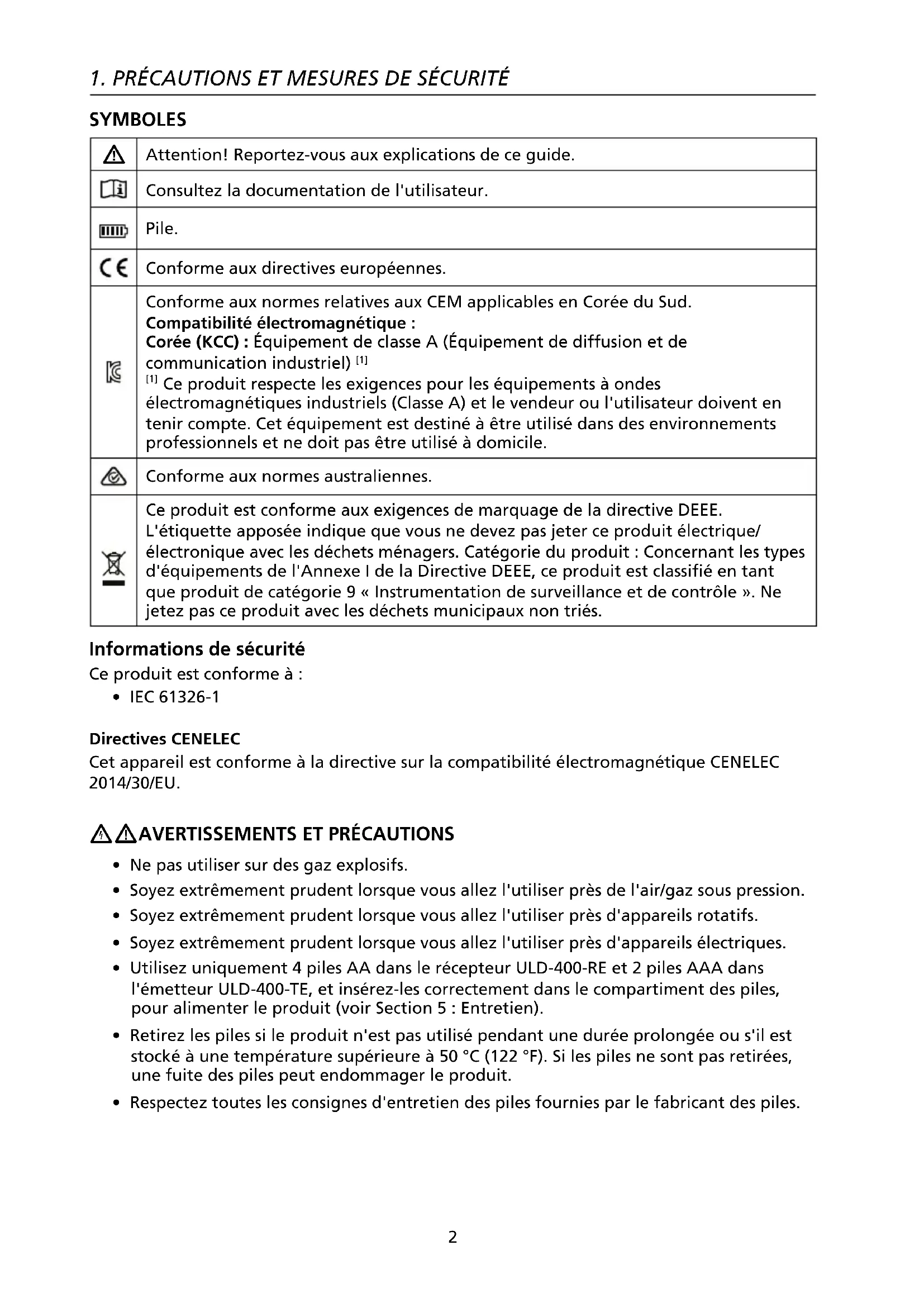 - IEC 61326-1 Directives CENELEC Cet appareil est conforme à la directive sur la compatibilité électromagnétique CENELEC 2014/30/EU.