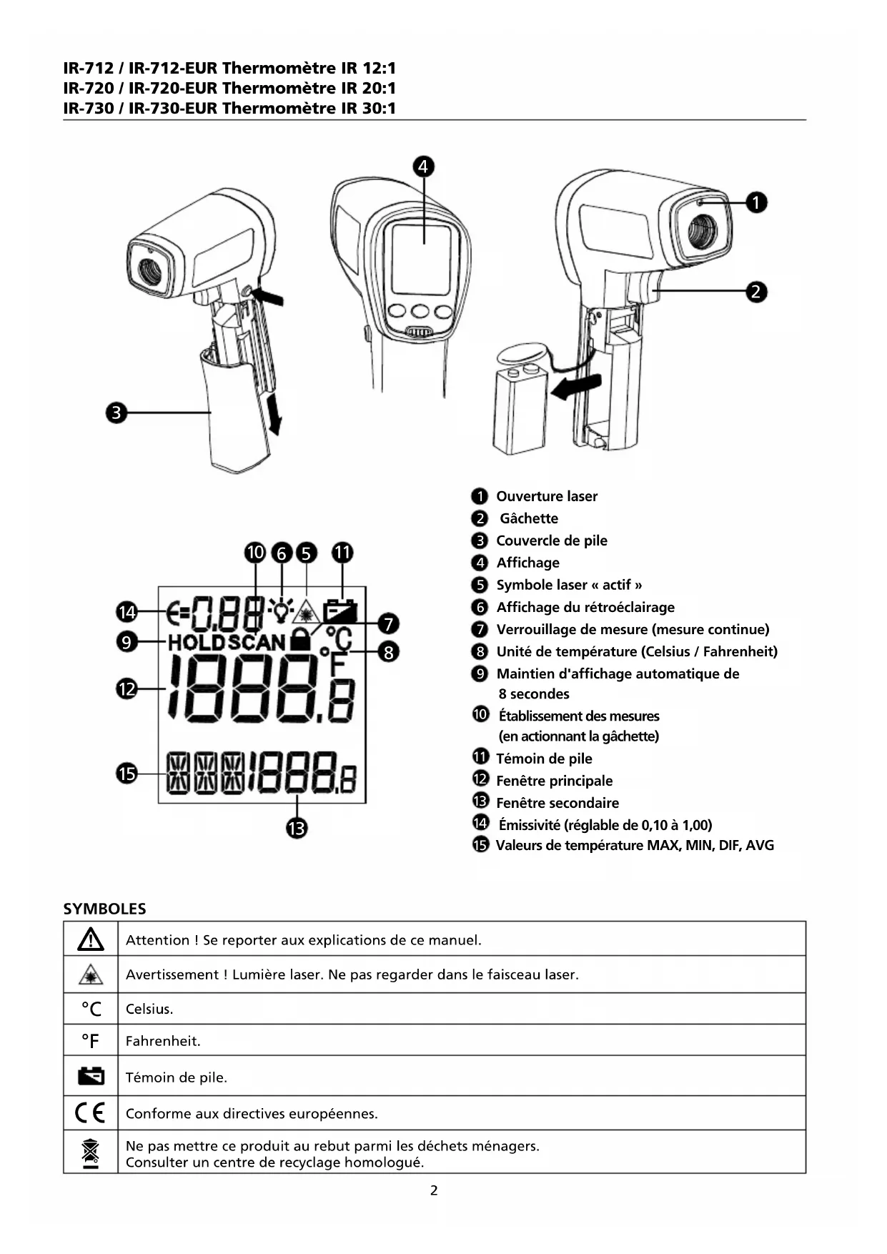 Attention ! Se reporter aux explications de ce manuel.Avertissement ! Lumière laser. Ne pas regarder dans le faisceau laser. Celsius. Fahrenheit.Témoin de pile. Conforme aux directives européennes. Ne pas mettre ce produit au rebut parmi les déchets ménagers. Consulter un centre de recyclage homologué. IR-712 / IR-712-EUR Thermomètre IR 12:1 IR-720 / IR-720-EUR Thermomètre IR 20:1 IR-730 / IR-730-EUR Thermomètre IR 30:1