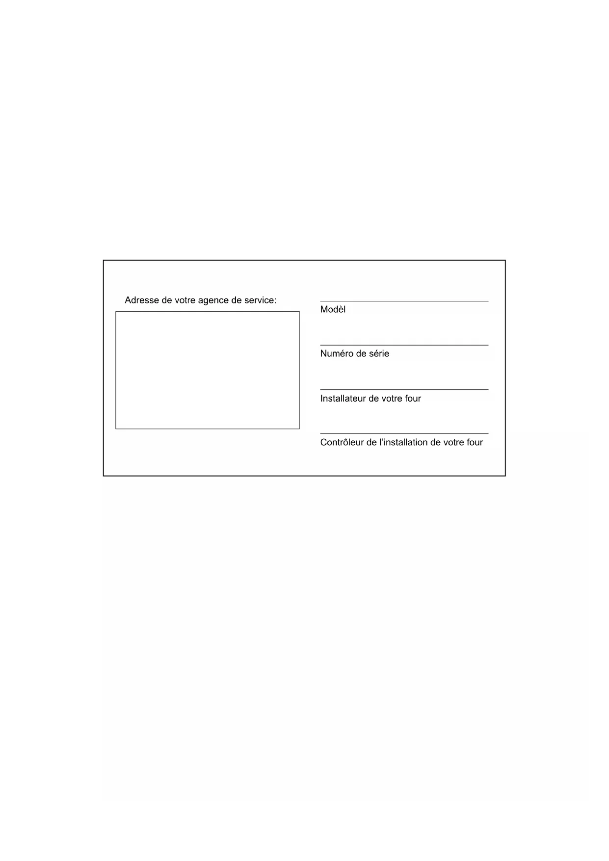 ENDROIT BIEN VISIBLE. Vous pouves vous les procerer au- près de votre fournissear de gaz local. AVERTISSEMENT Ne pas entreposer ni utiliser de l’essence ni d’autres vapeurs ou liquides inammables dans le voisinage de cet appariel, ni de tout autre appareil. Les informations données dans le présent manuel sont impor- tantes pour installer, utiliser et entretenir correctement ce four. Le respect de ces instructions et procédures permettra d’obtenir de bons résultats de cuisson et une longue durée de service sans problèmes. Veuillez lire le présent manuel et le conserver pour pouvoir vous y reporter à l’avenir. ERREURS: Les erreurs de de- scription, de typographie ou d’illustration font l’objet de corrections. Les caractéris- tiques sont sujettes à modi- cations sans préavis.